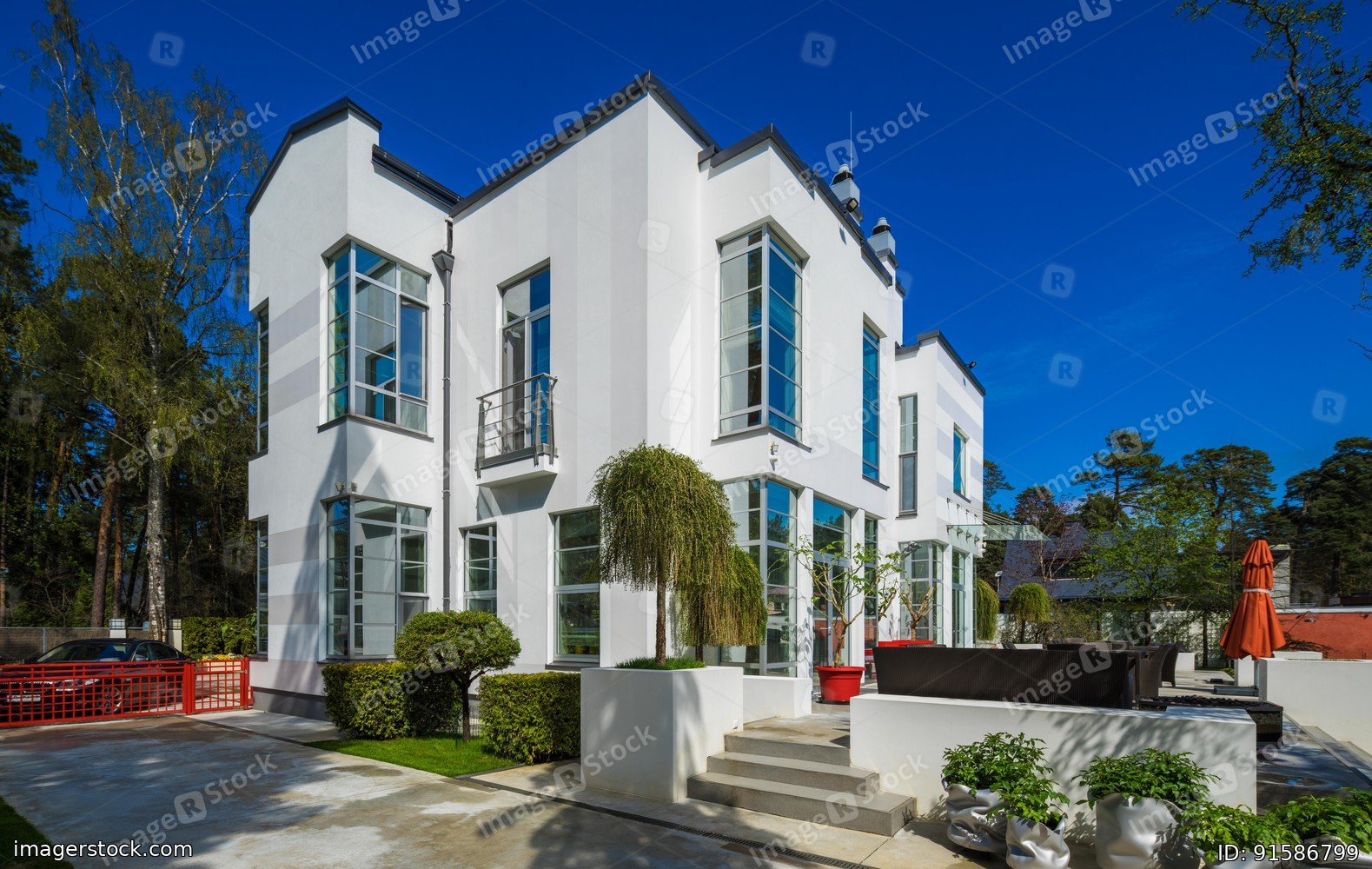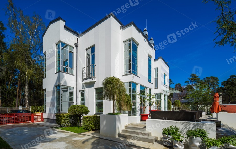 Modern exterior of luxury private house. Facade. Sunny summer day.