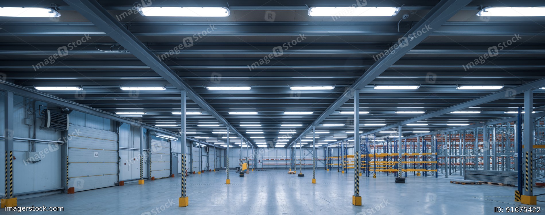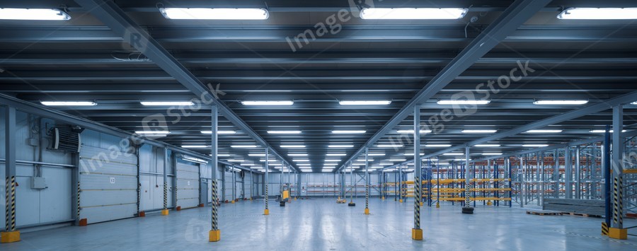 Interior of huge empty storehouse. Industrial warehouse racking.
