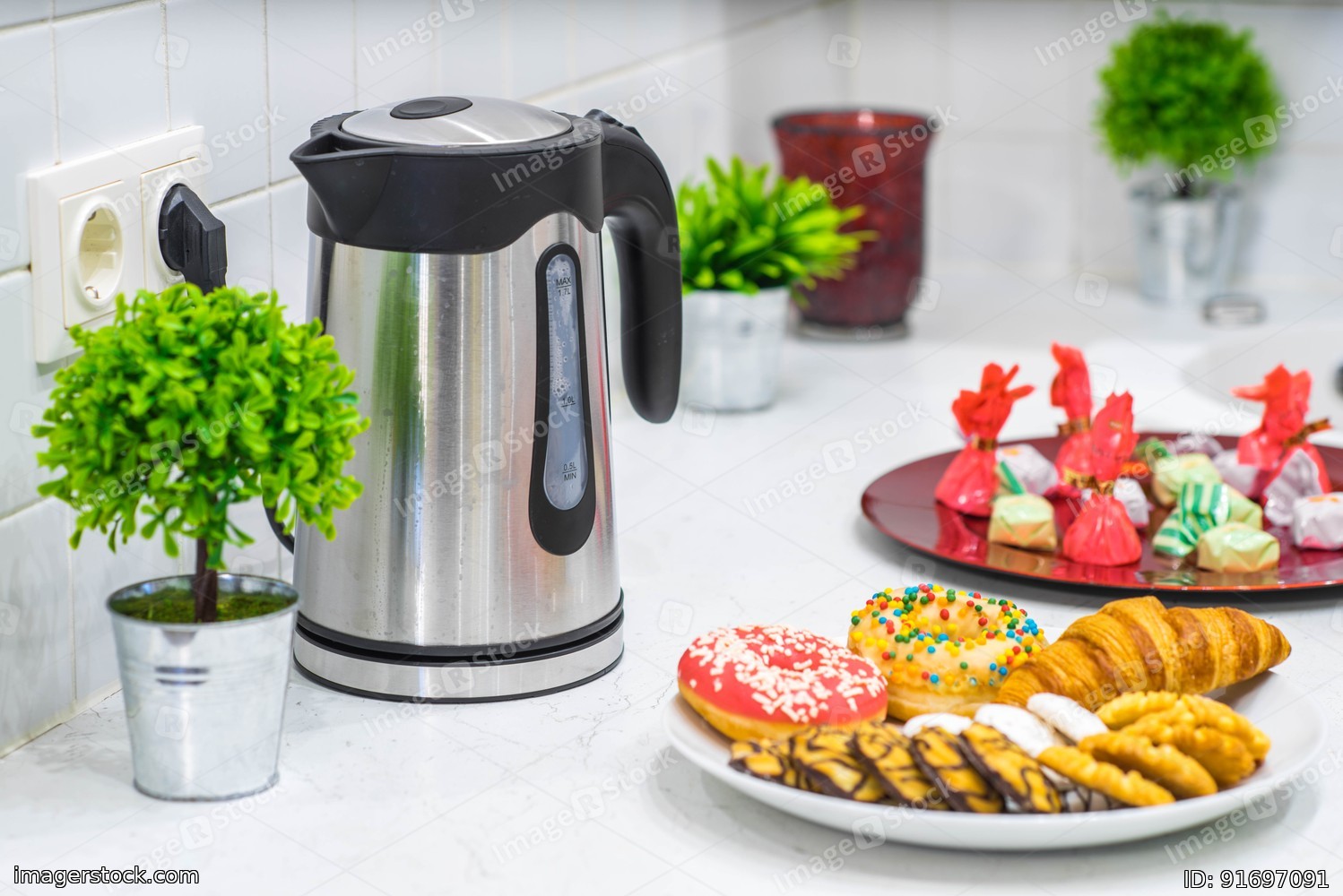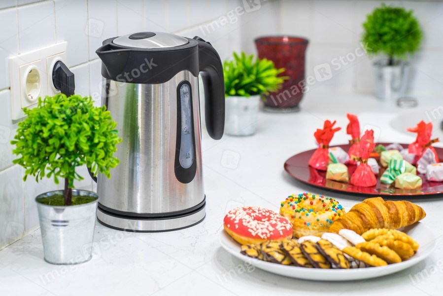 Close up of dish with cookies and donuts. White tile. Kettle and decor.