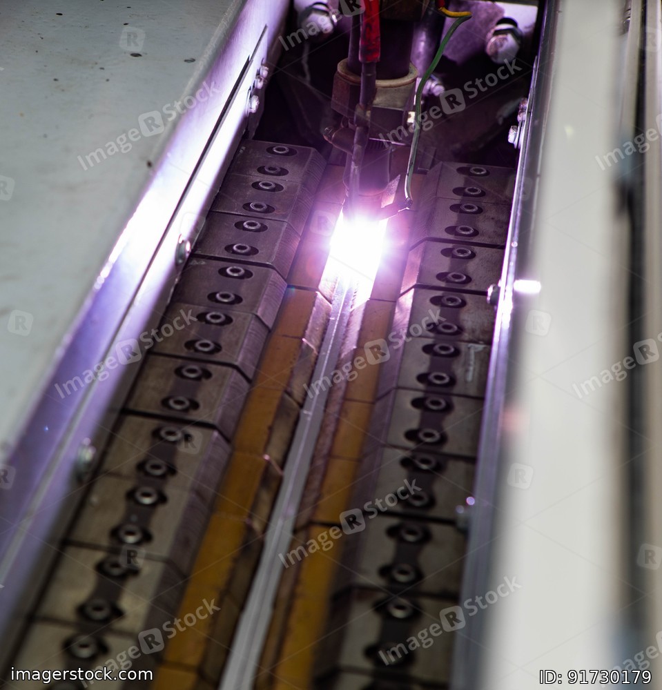 Working overlap arc welding machine. Welded seam. Welding sparks.