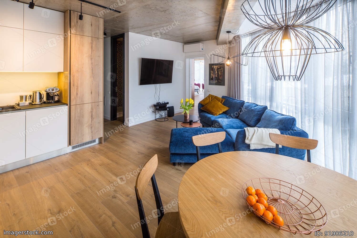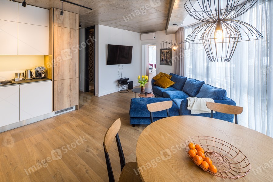 Interior living room bathroom with a sofa in the studio apartment. Concrete ceiling. Loft.