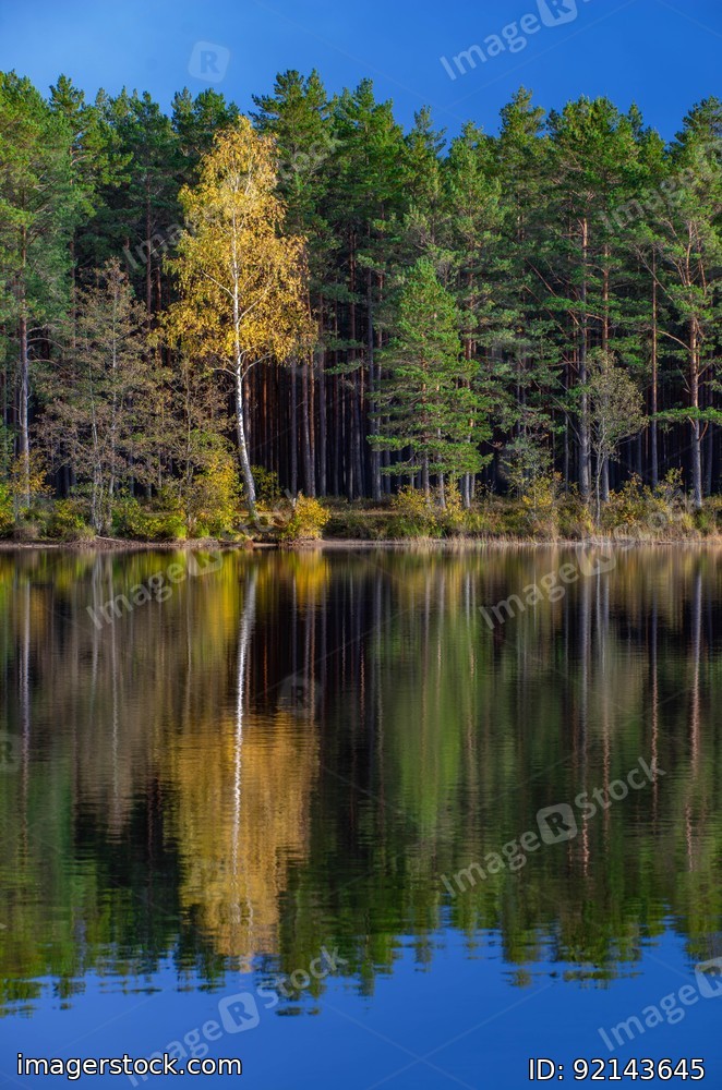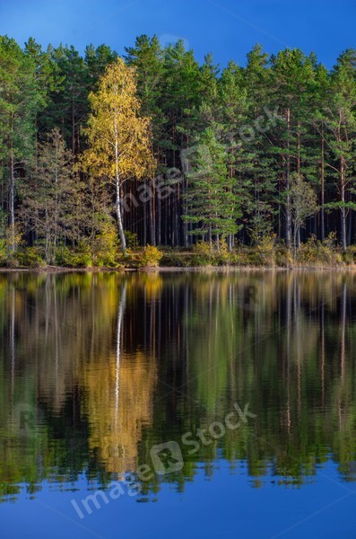 Latvian nature. Kangari lake in forest. Reflection in water.