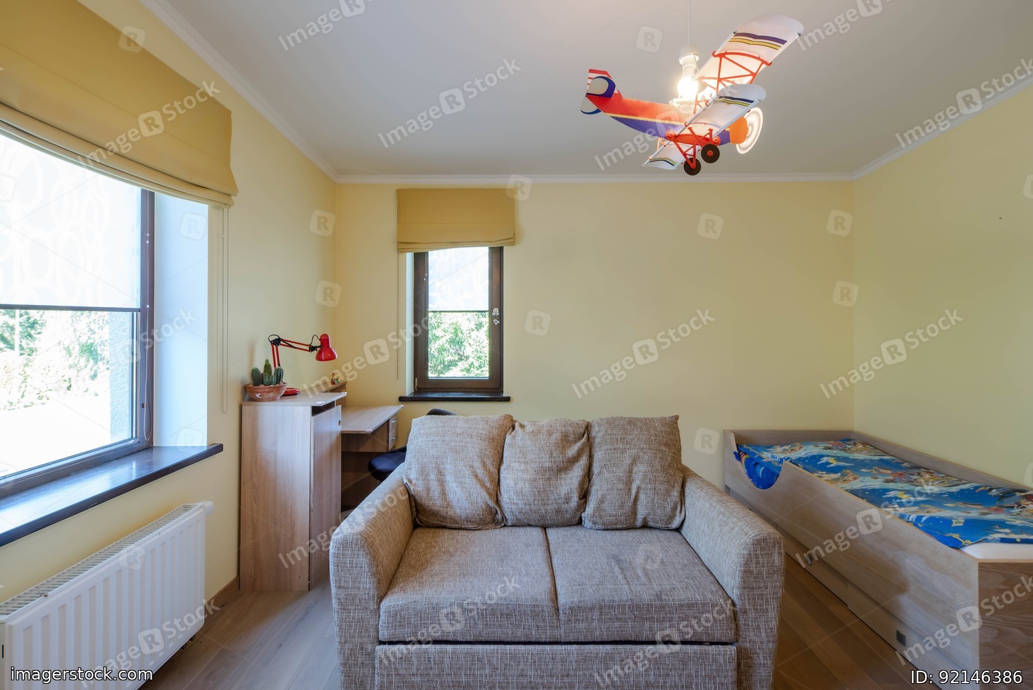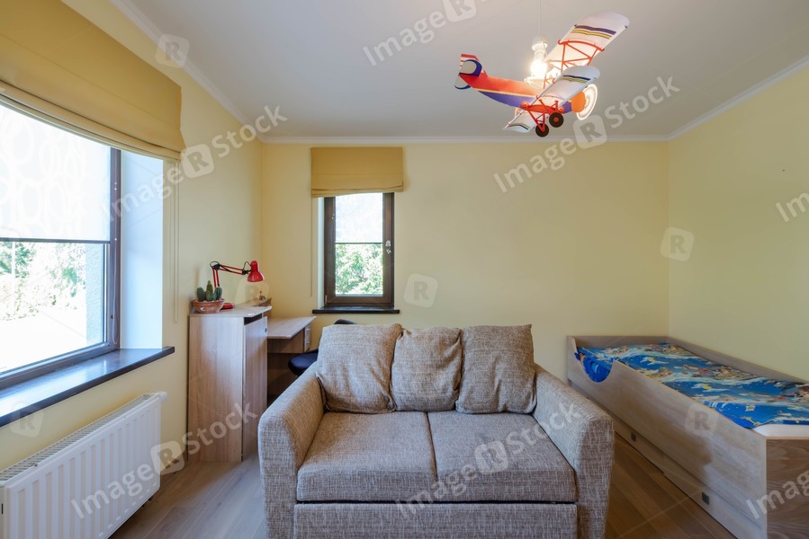 Contemporary interior in yellow tones of kid`s room in luxury flat. Soft couch. Wooden bed.