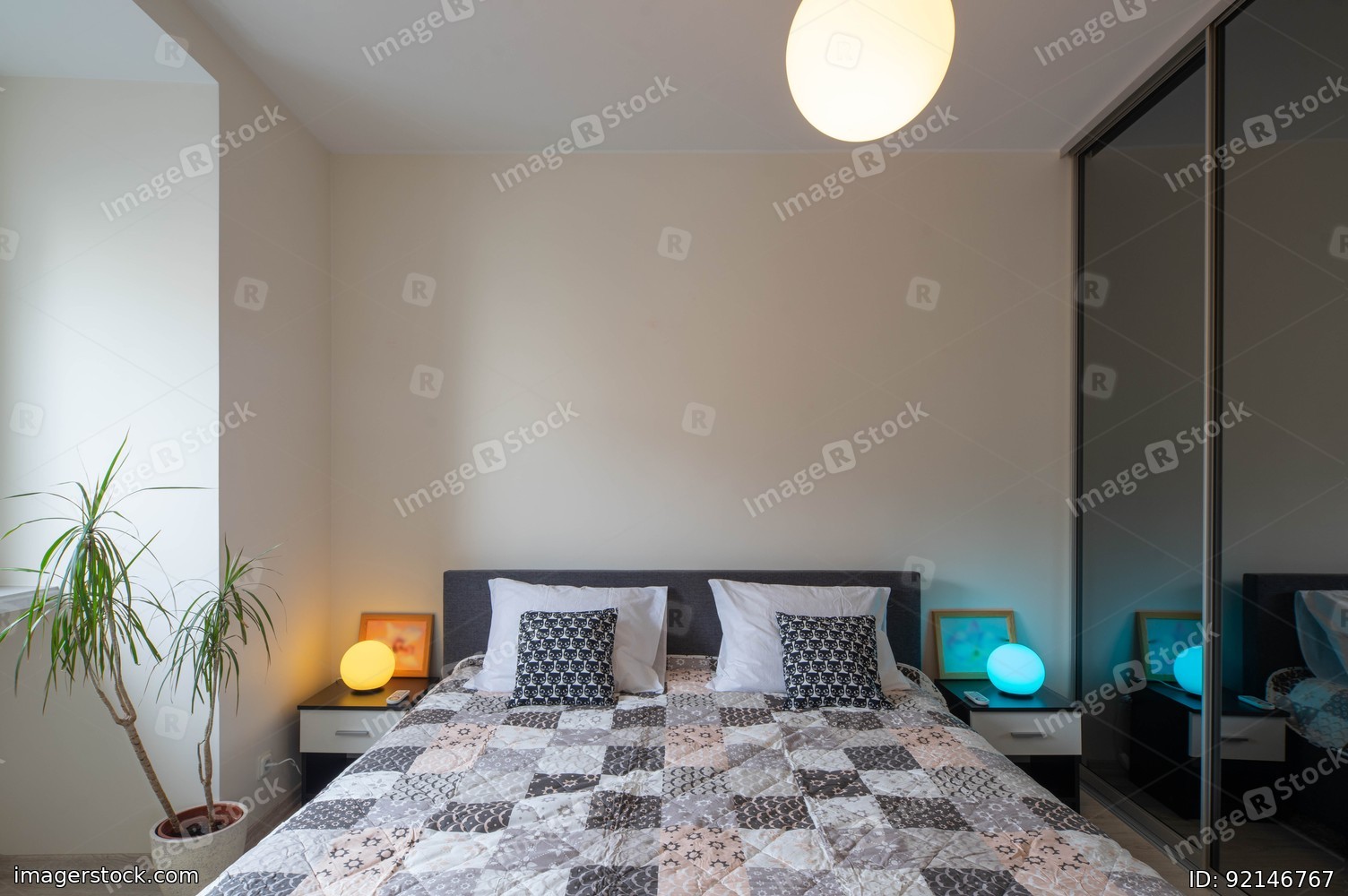Modern interior of bedroom. Bed with pillows and blanket. Bedsides with lamps.
