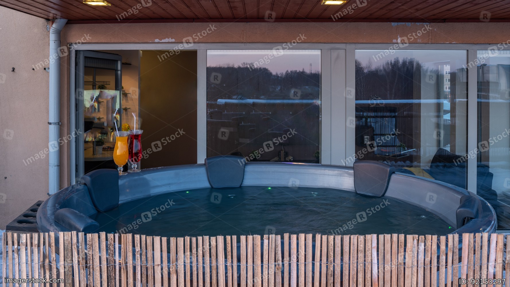 Open terrace with hot outdoor wooden bath tub. Luxury private house.