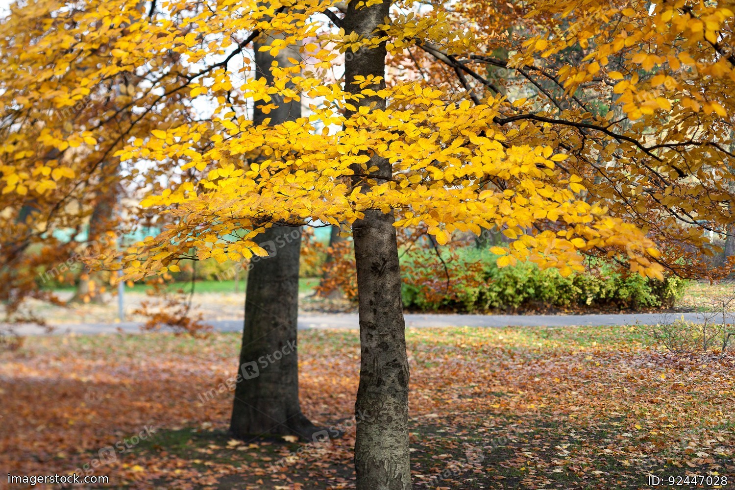 Autumn leaves on the trees. Yellow leaves.