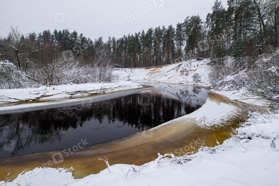 Winter scenery. Unfrozen river in snowy forest. Beautiful nature.