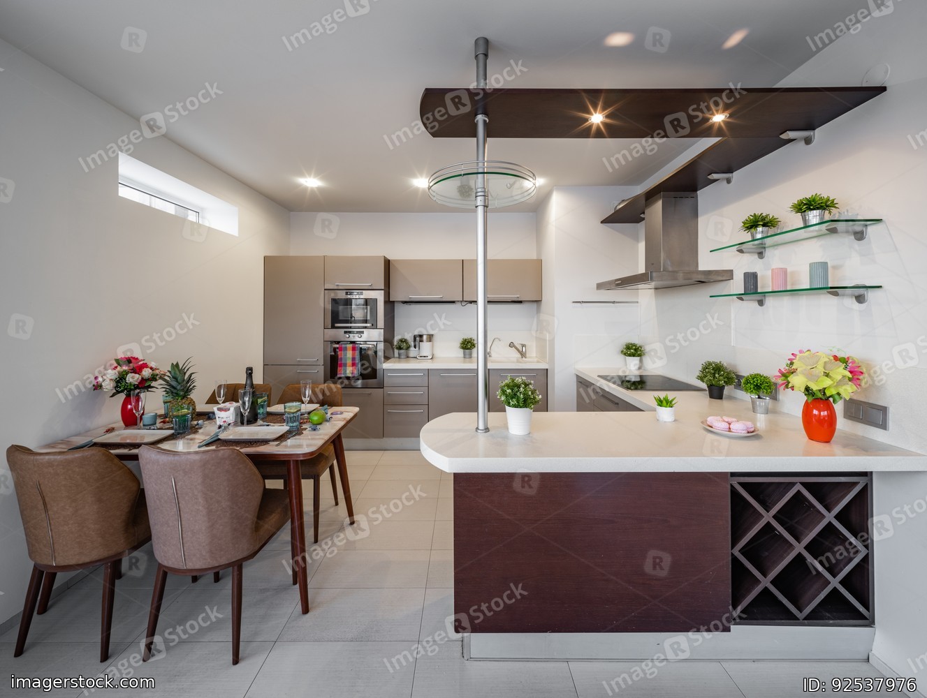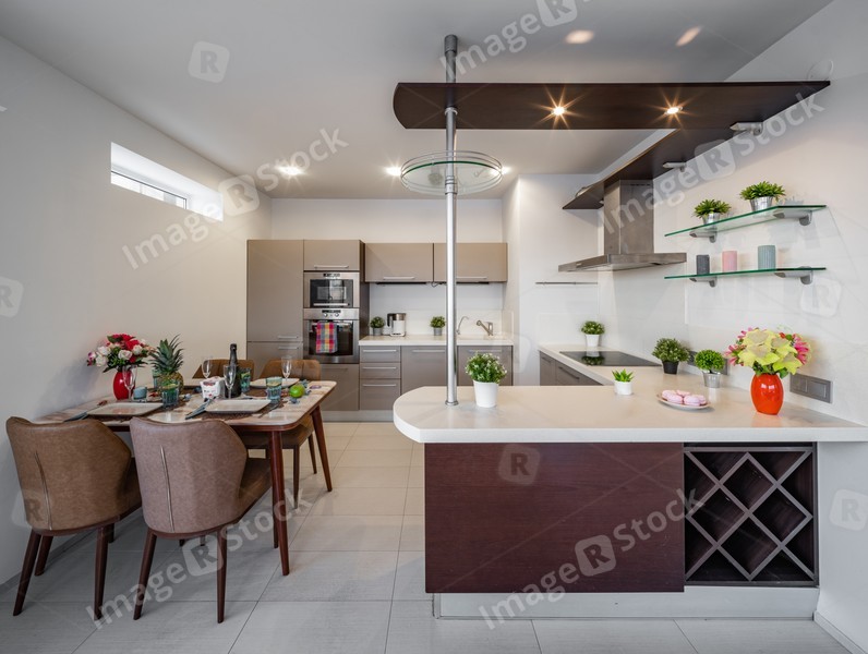Modern interior of kitchen in luxury studio apartment.