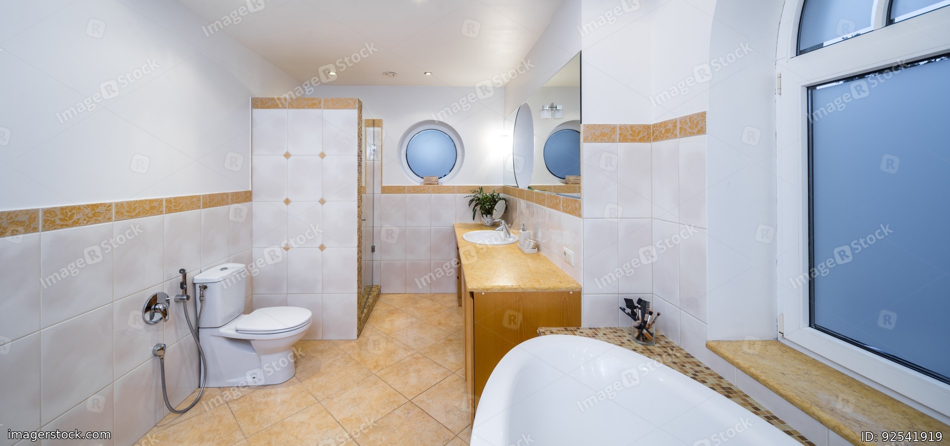 Panorama of big light bathroom in modern interior.