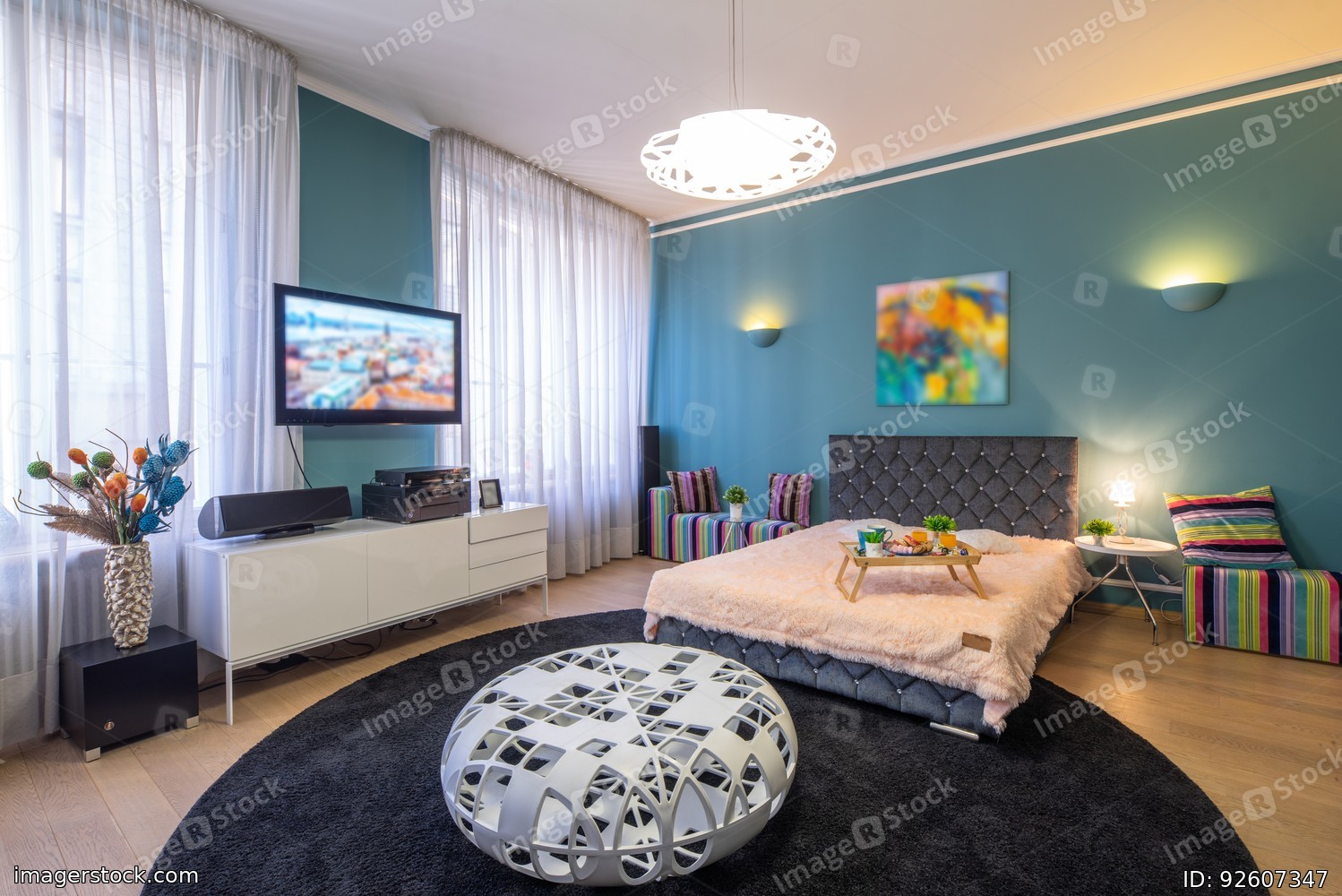 Modern interior of spacious studio apartment. Living room. King-size bed.