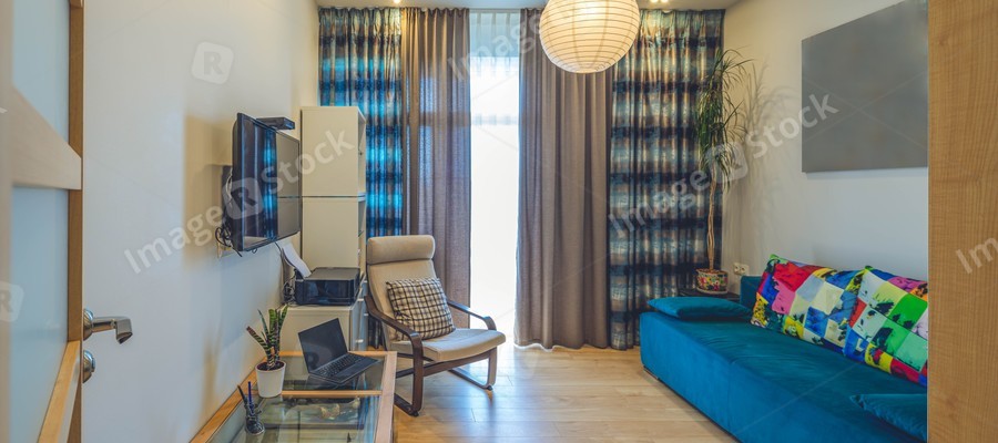 Modern interior of living room in luxury flat. New furniture. Laptop on table. TV on wall. Window with curtain.
