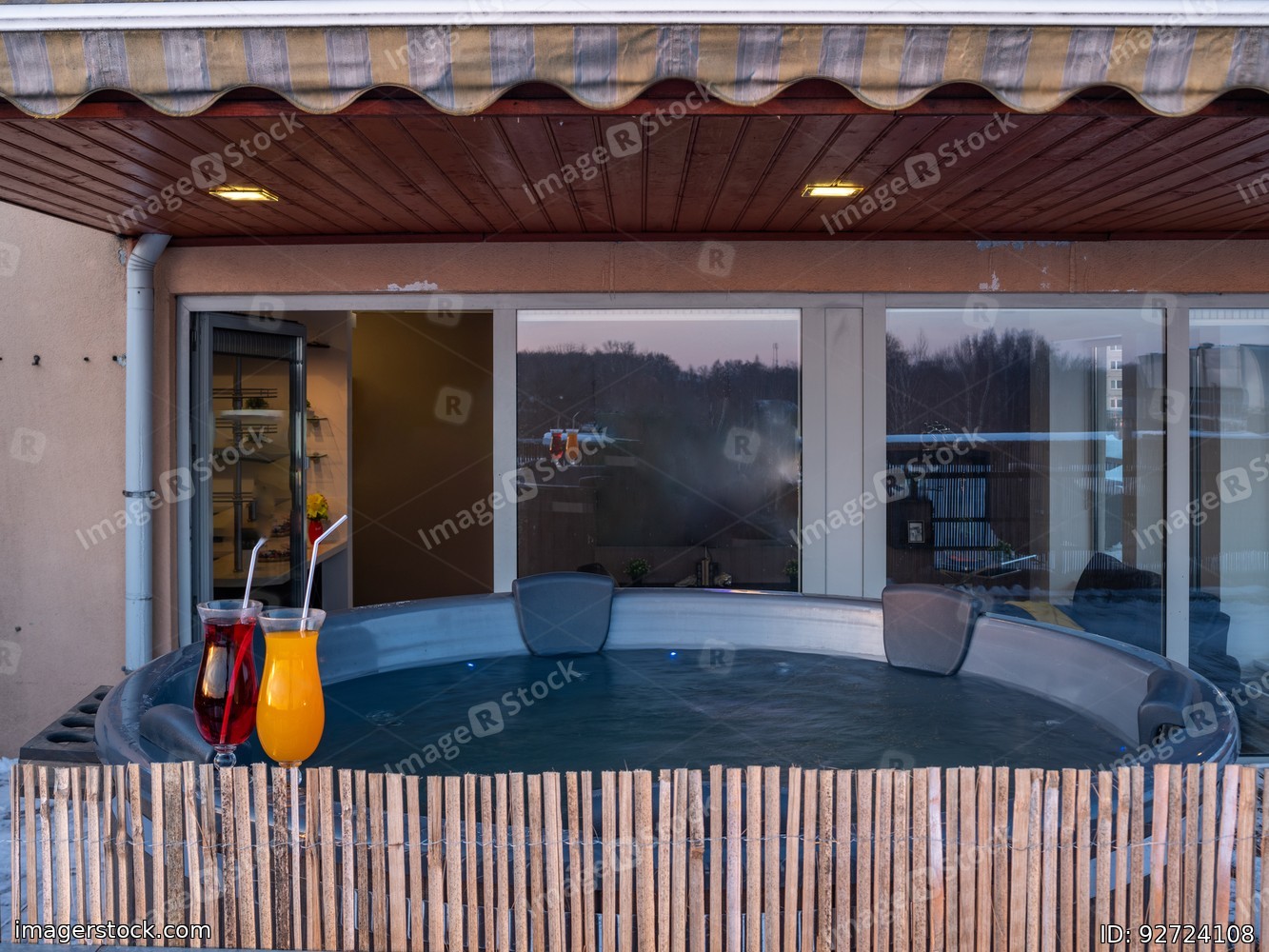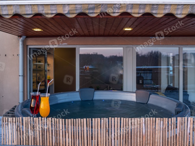 Open terrace with hot outdoor wooden bath tub. Luxury private house.