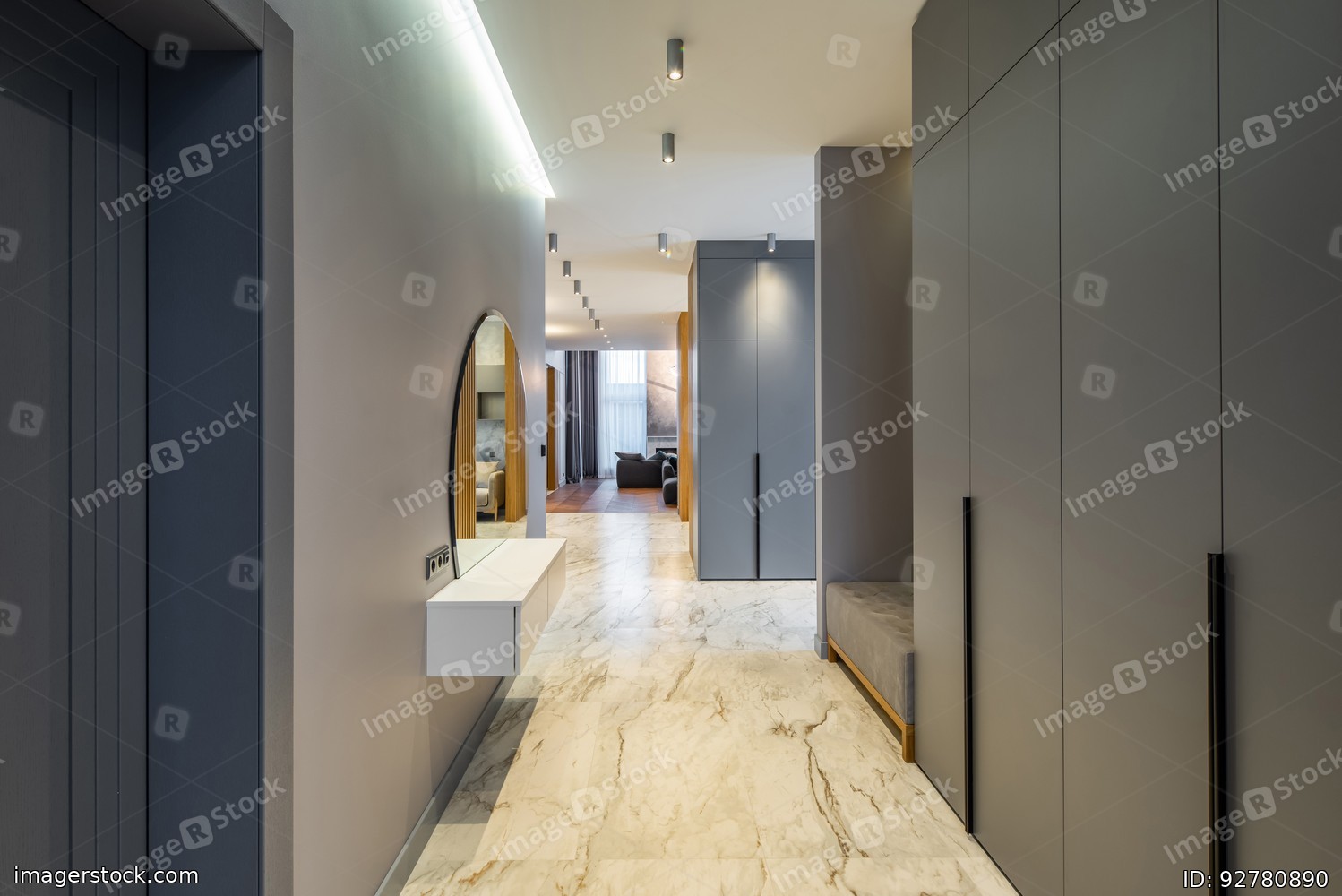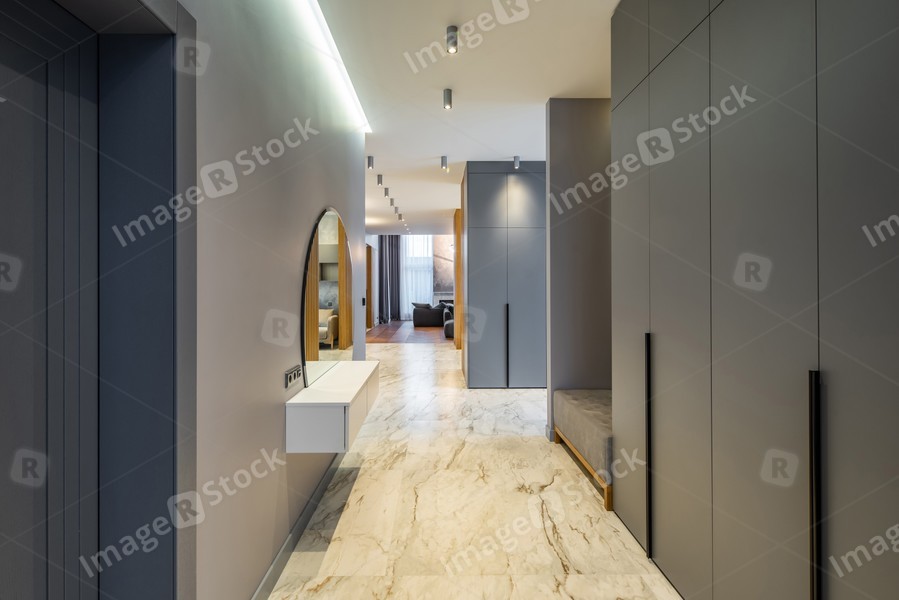 Modern interior of luxury private house. Grey tones. Entrance hall.