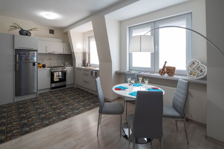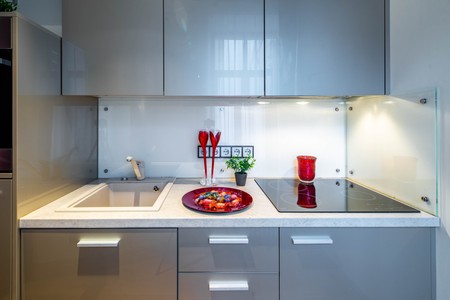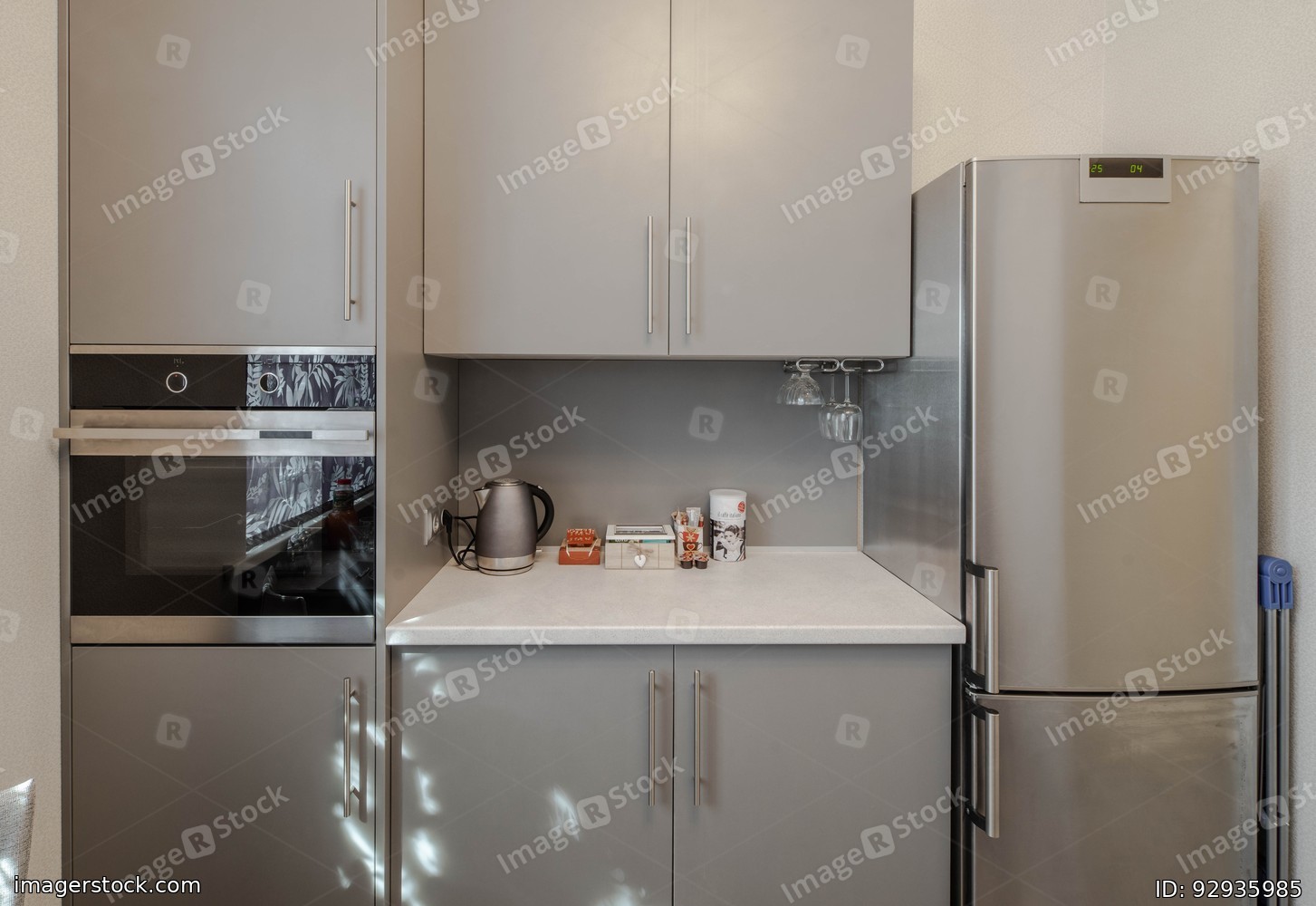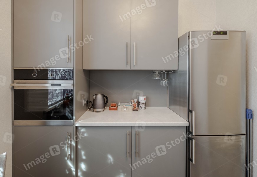 Kitchen appliances. Modern interior in shades of hrey.