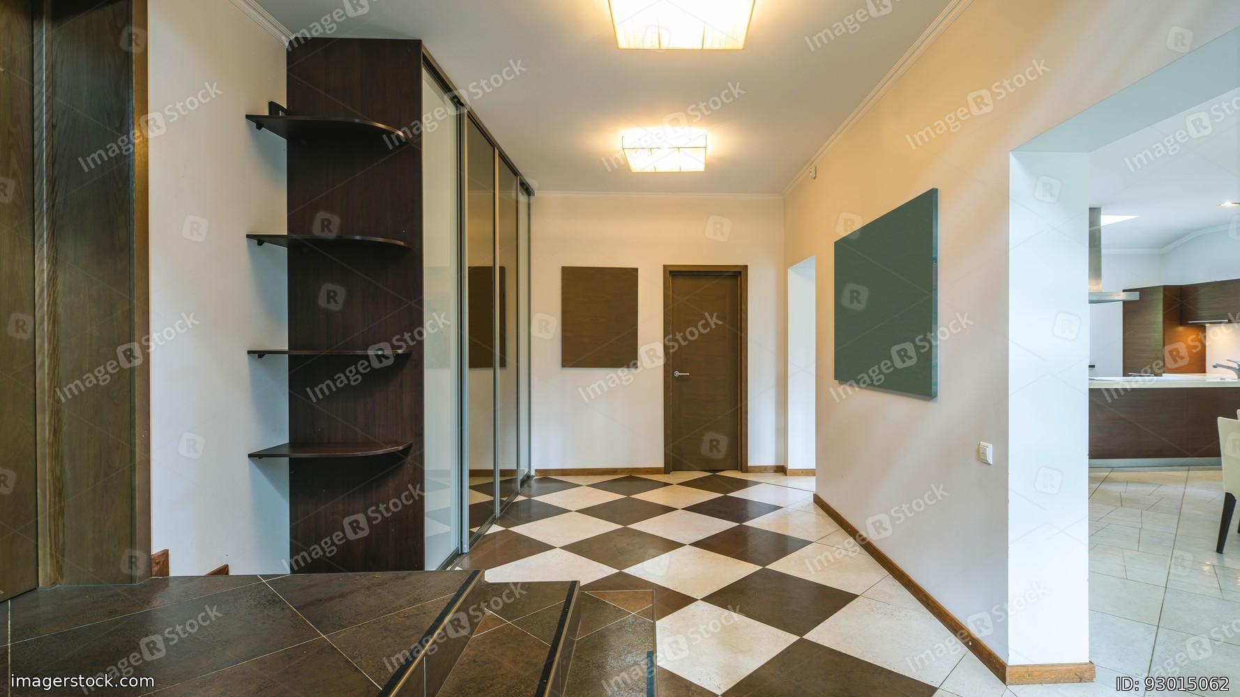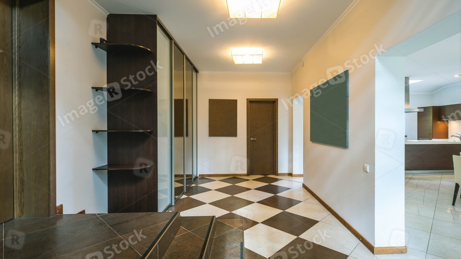Modern interior of entrance hall in private house. Luxury apartment. Tile floor. Mirror sliding door wardrobe with shelves.