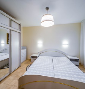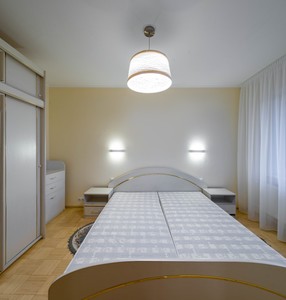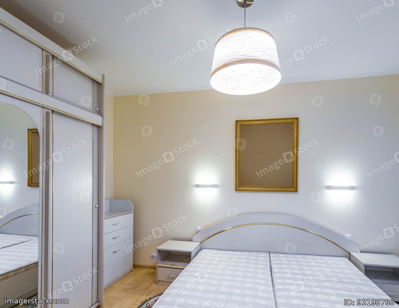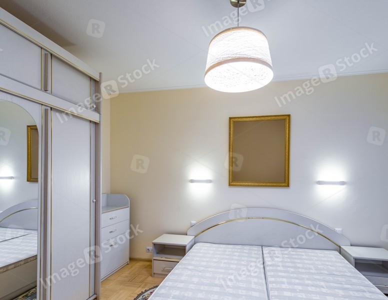 Contemporary interior of cozy bedroom in modern flat. Wardrobe, dresser, nightstands and bed.