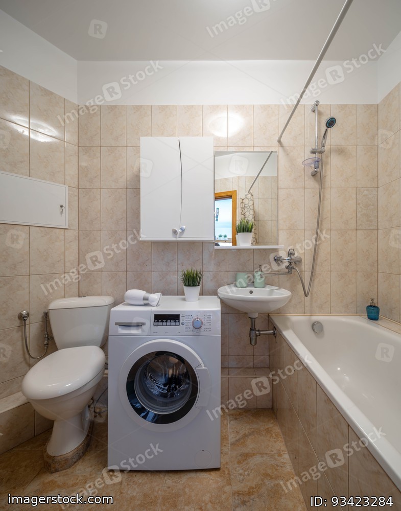 White toilet and sink with mirror. Bath and washing machine. Beige tile in bathroom.