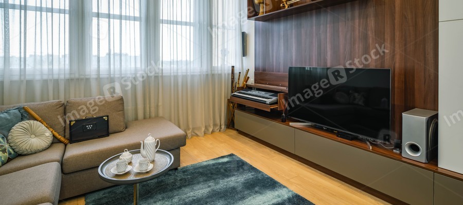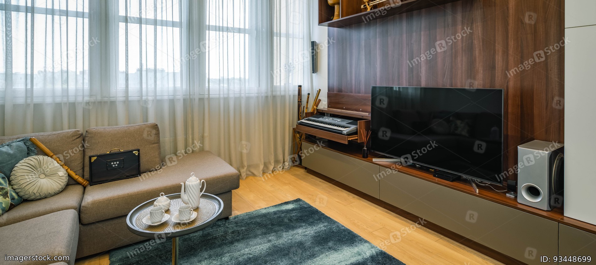 Contemporary interior of studio apartment with cozy furniture. Window with tulle. TV on wall unit. Home decor. Coffee table.