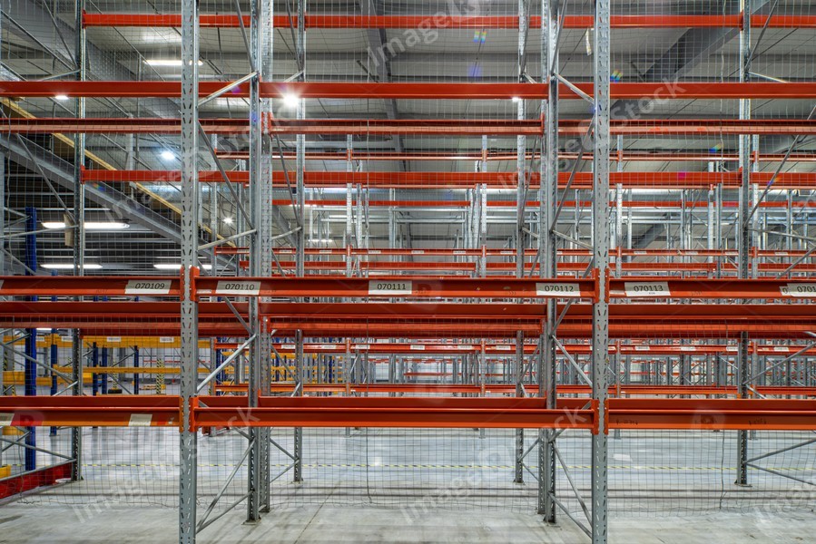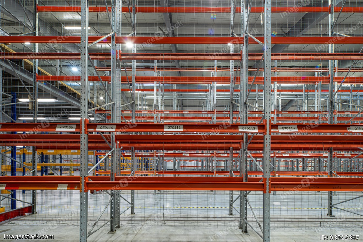 Interior of huge empty storehouse. Industrial warehouse racking.