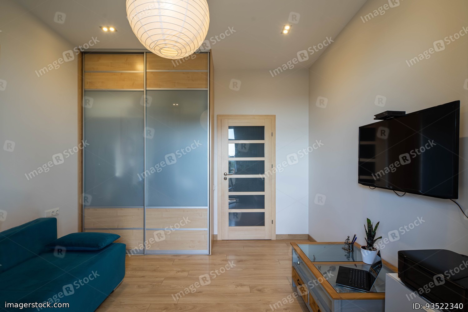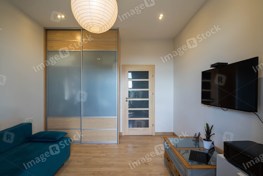 Modern interior of living room with white walls in luxury apartment. TV on wall. Laptop on table. Glass sliding door wardrobe.