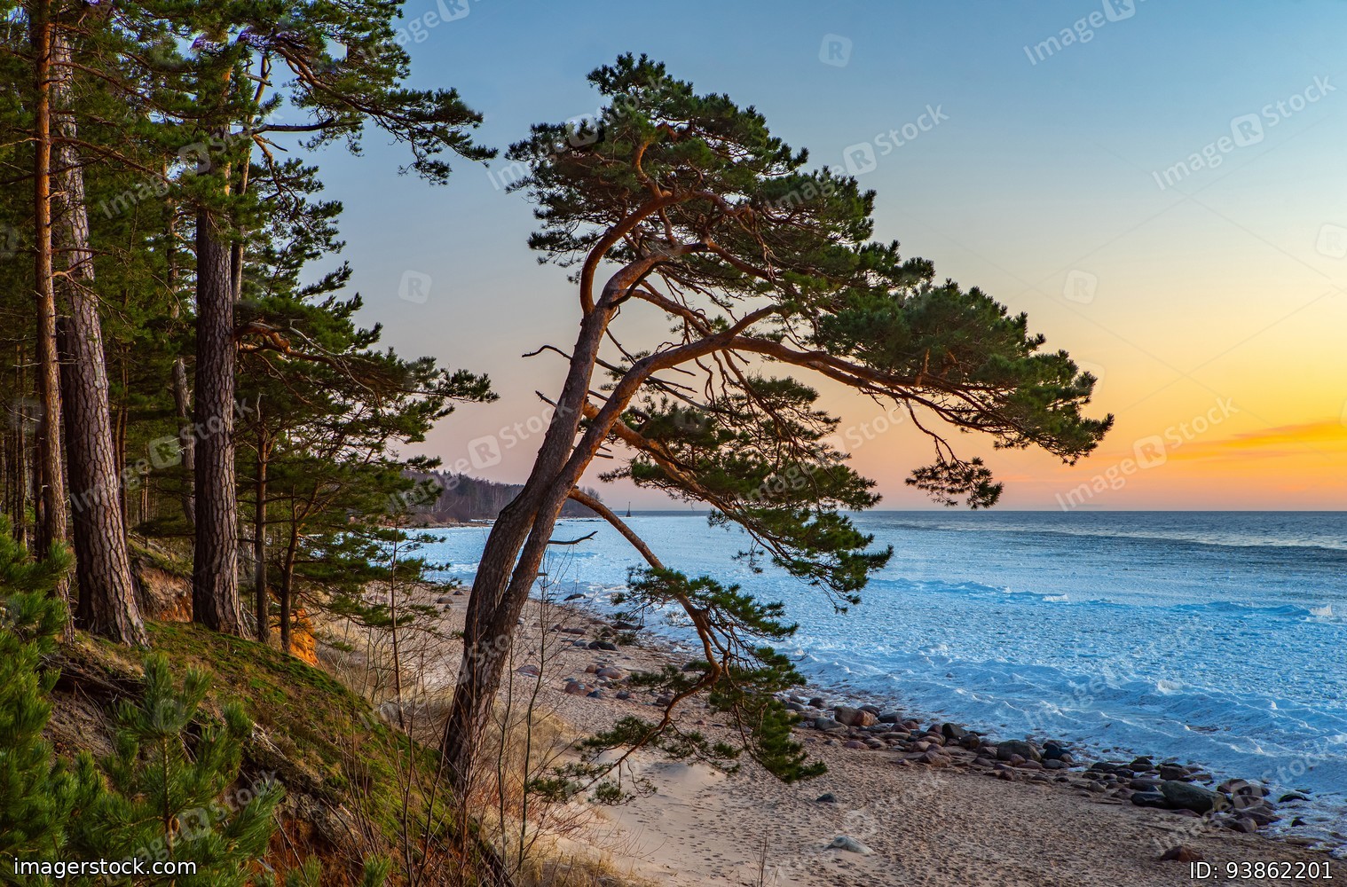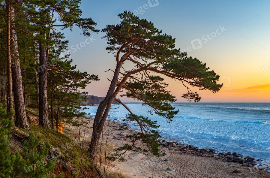 Beautiful landscape of Baltic sea. Sunny day. Pine trees.
