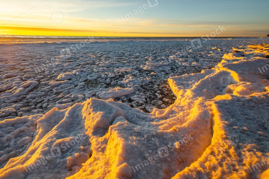 Close-up of snow and ice on sea shore at winter. Sunset sky.
