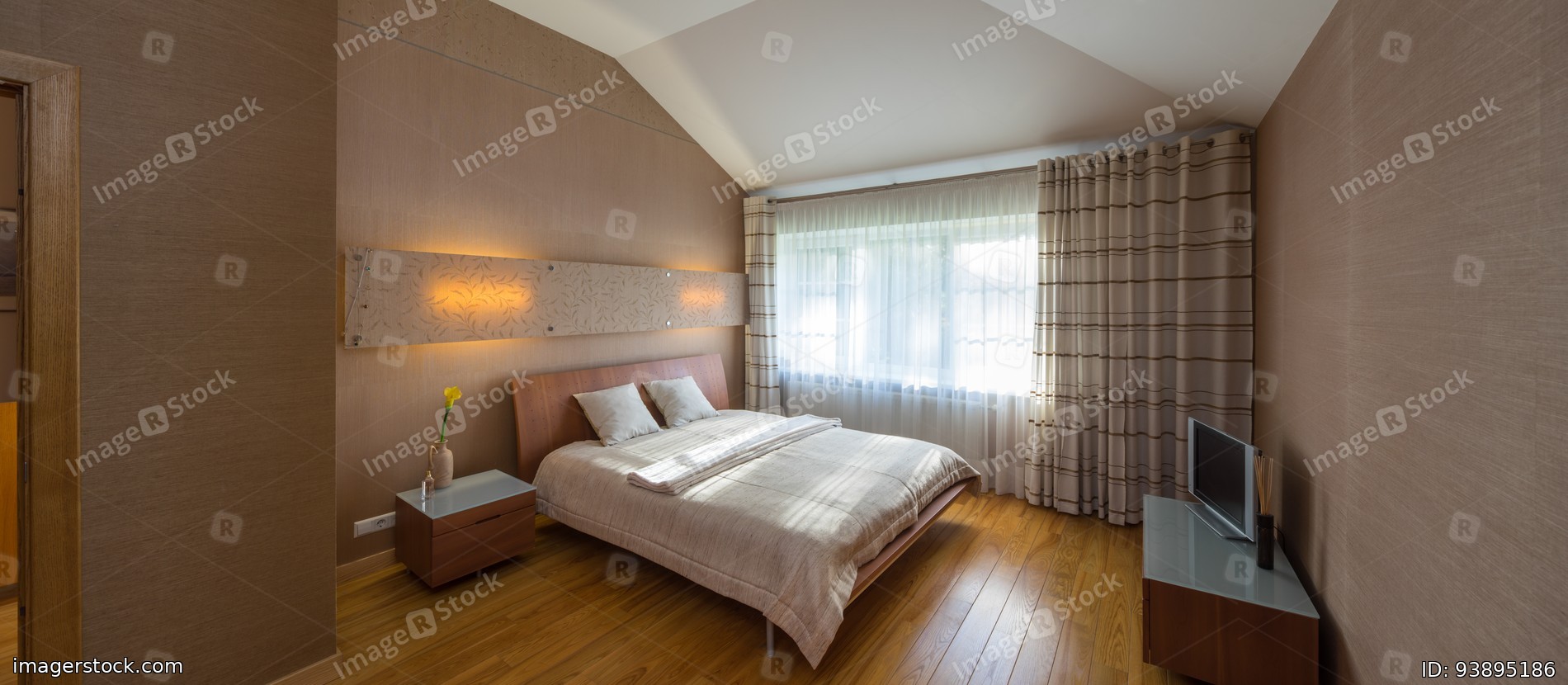 Panorama of comfortable cozy bedroom in modern interior.