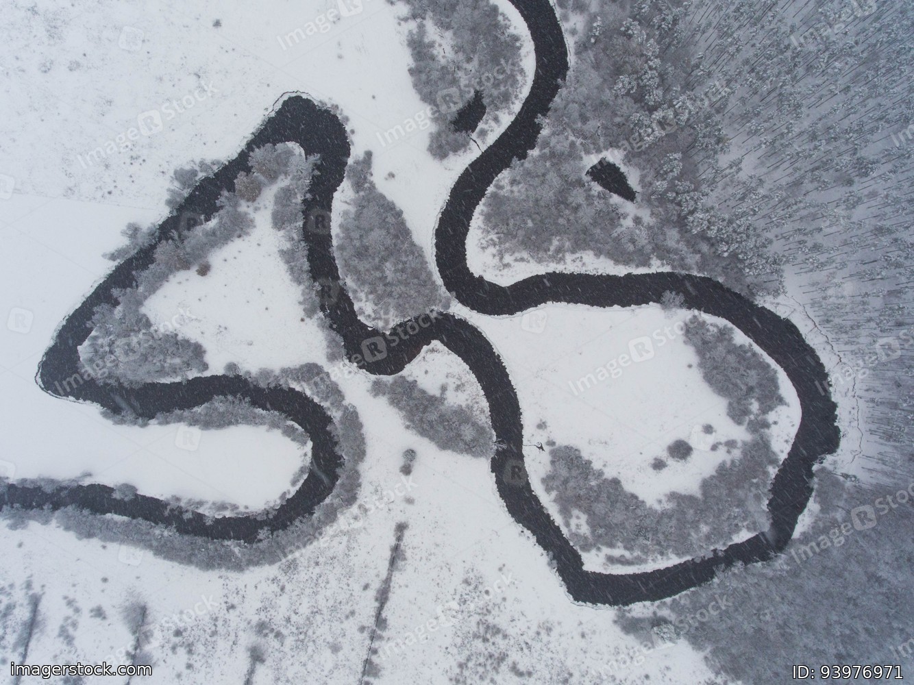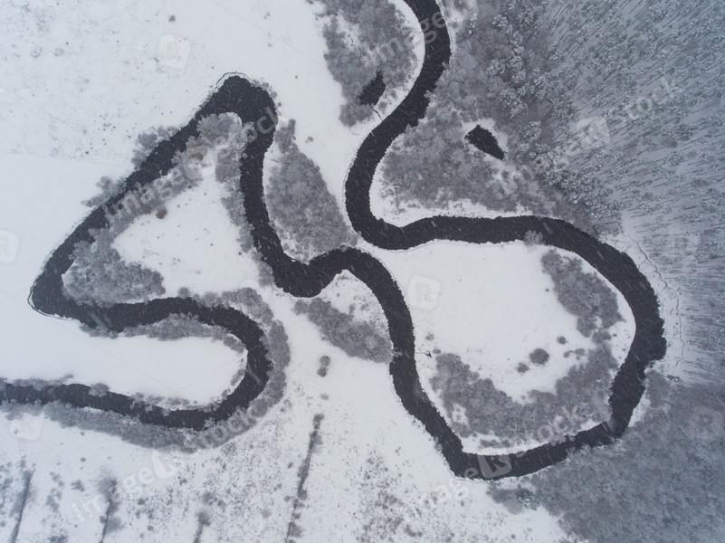 Top drone view of curved river. Scenic winter landscape. Forest and field covered by snow.