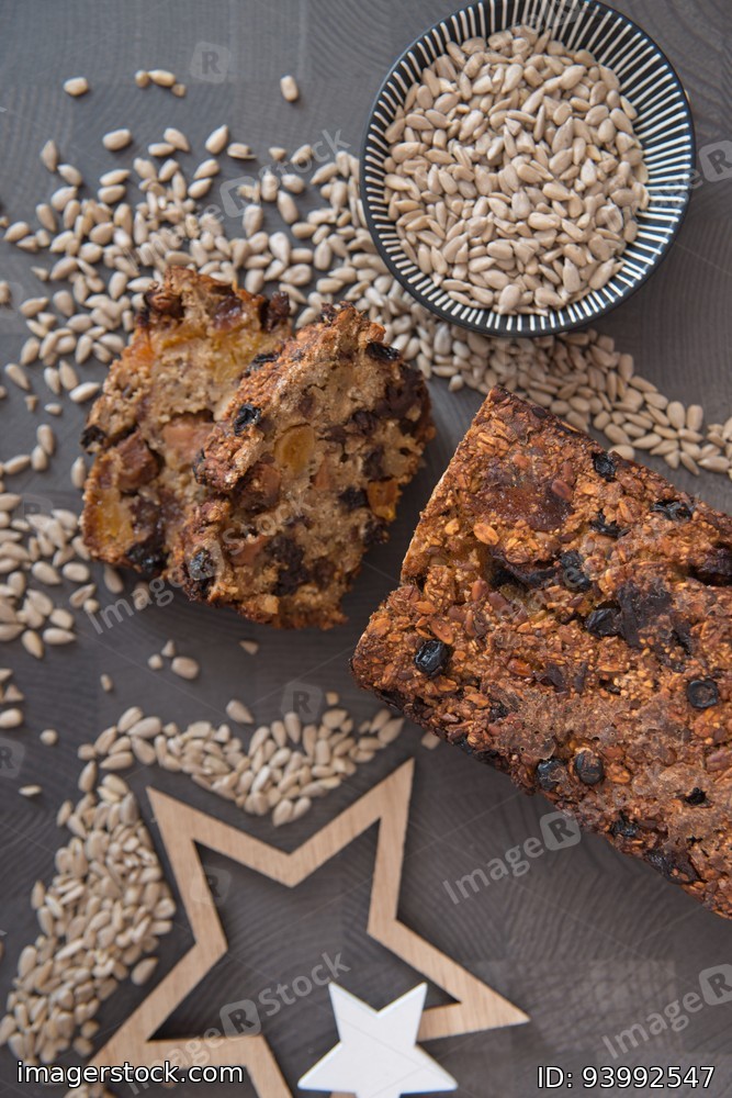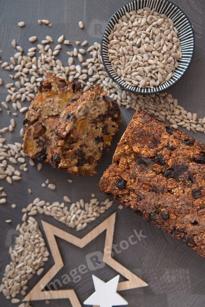 Homemade fruit bread with cosy winter decorations