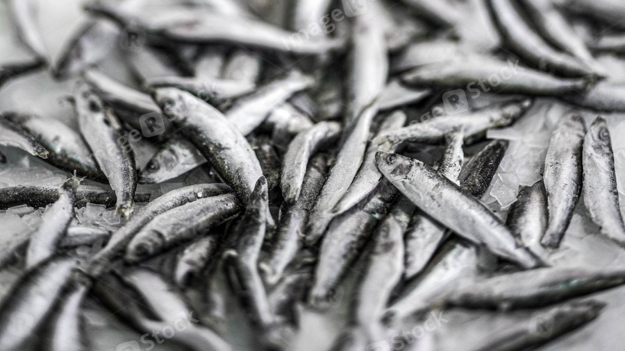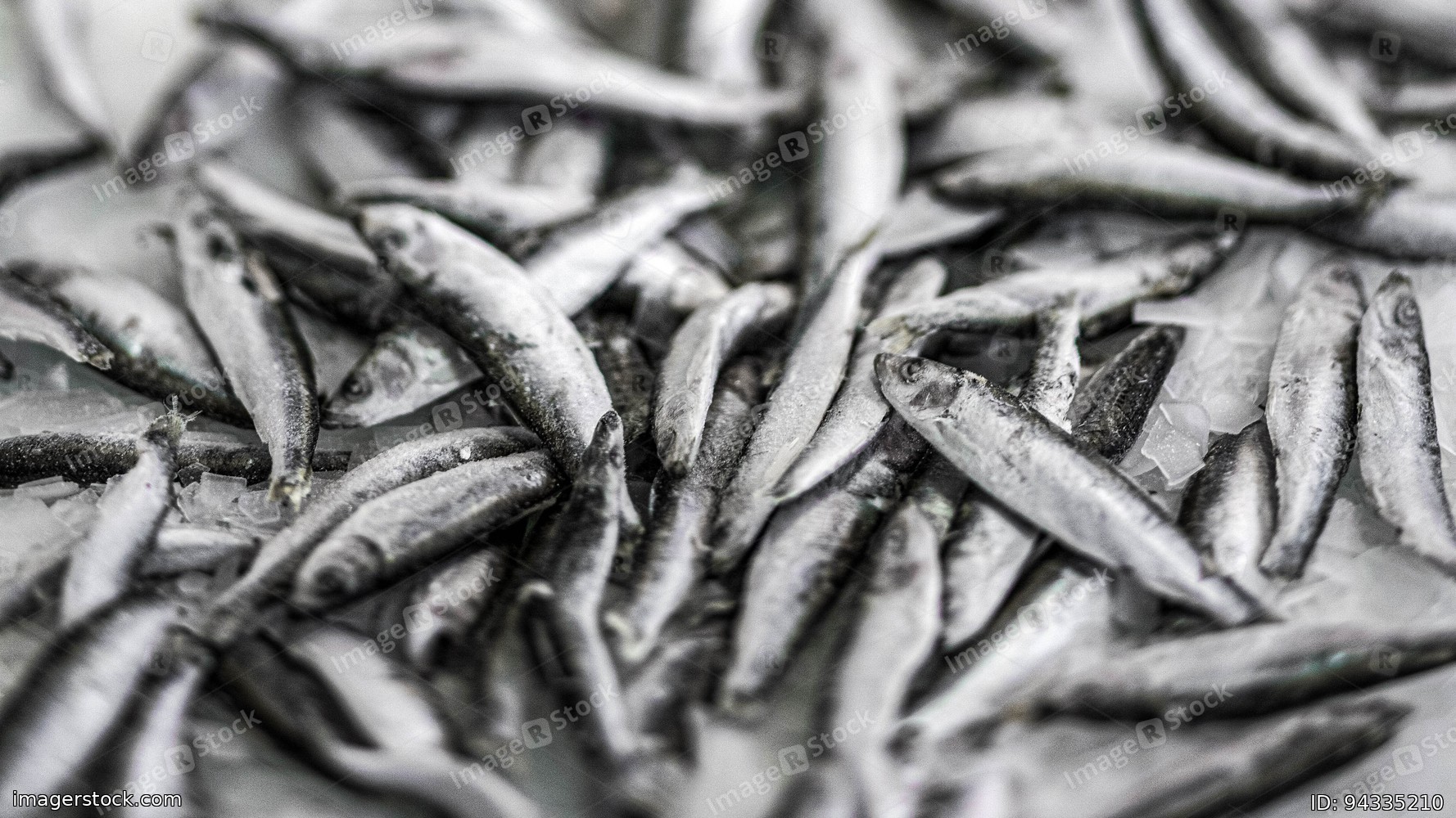 Close-up of fresh sprat on the ice in fish market. Winter fishing. Small silver fish production.