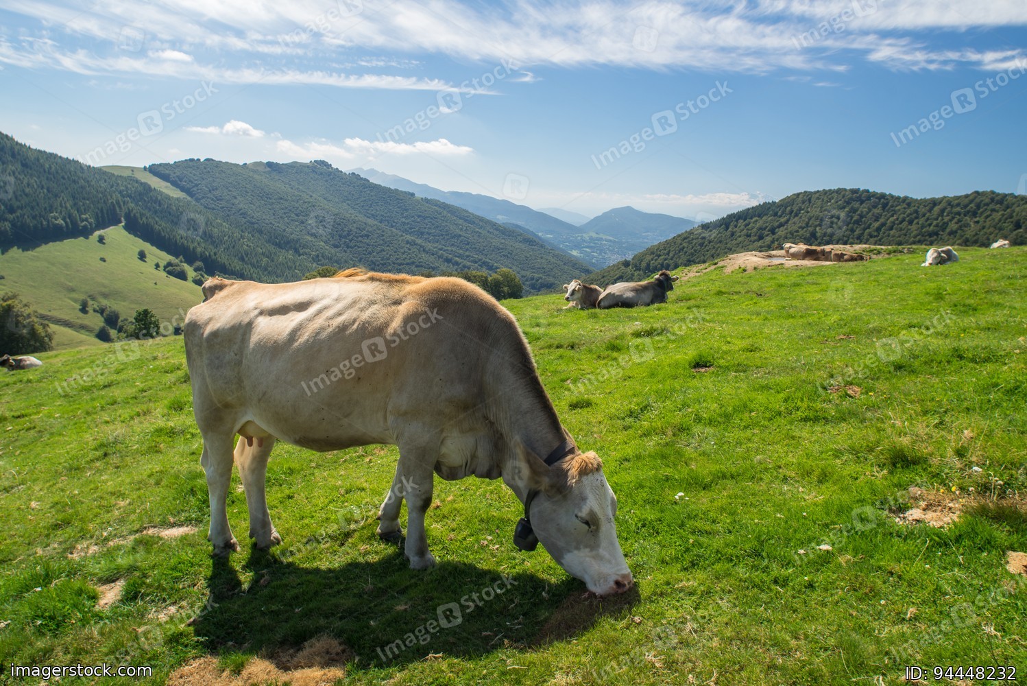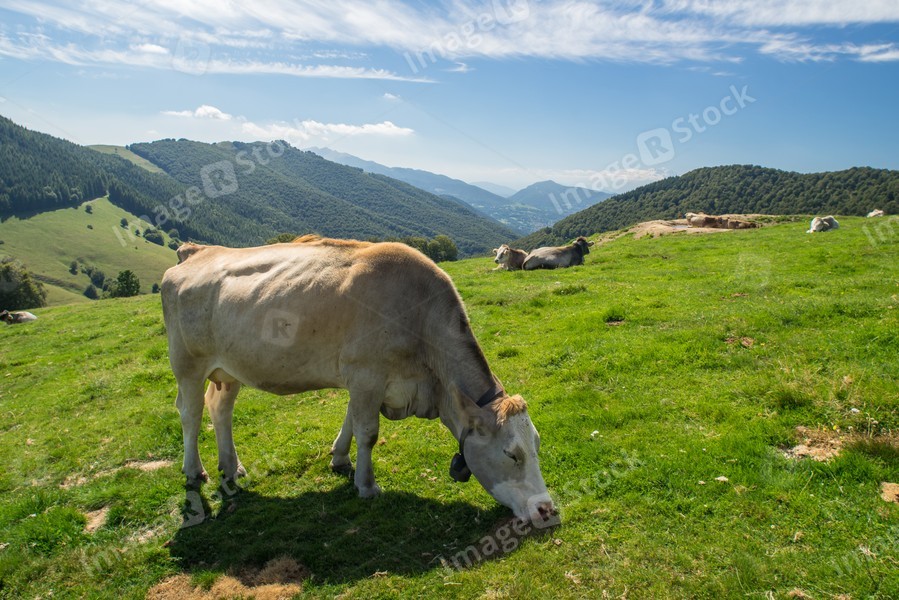 The pasture in the mountains. Cows grazing on the hills. Italy.