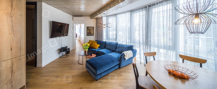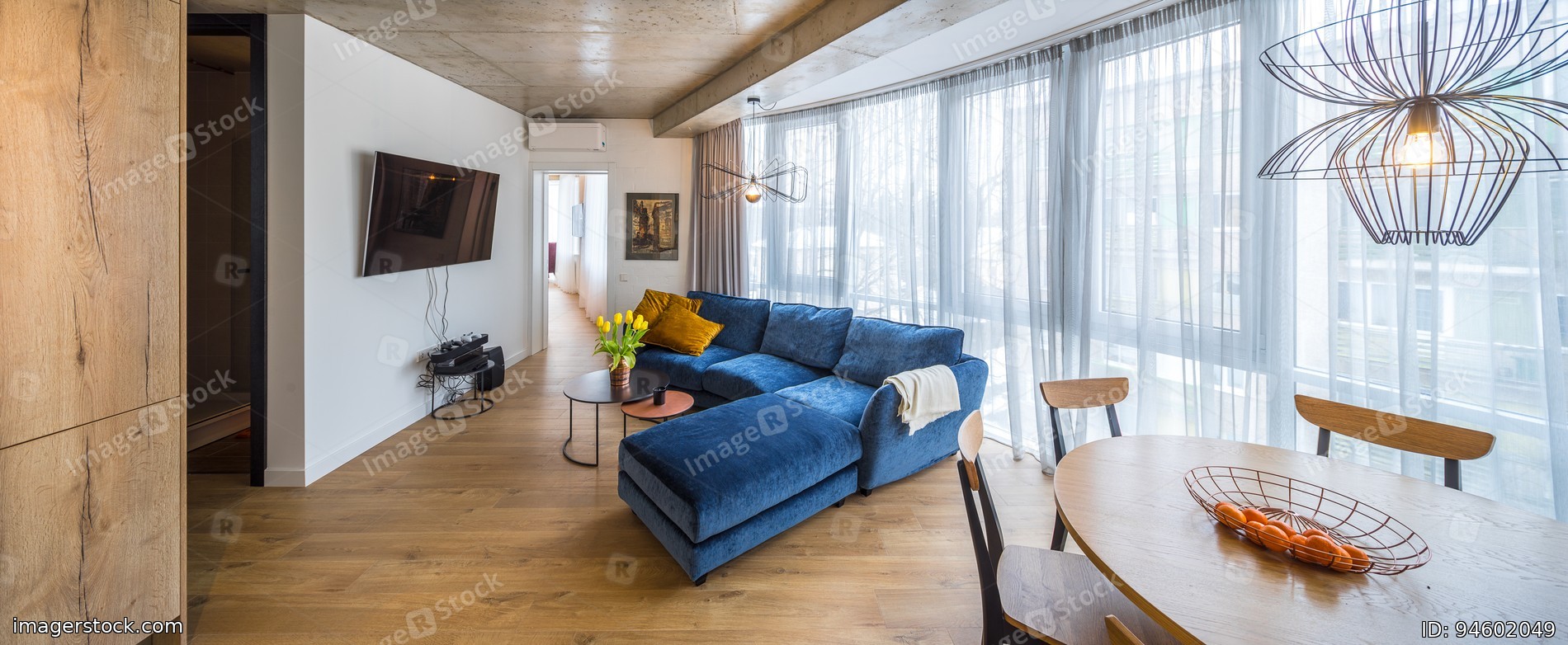 Panoramic Interior living room bathroom with a sofa in the studio apartment. Concrete ceiling. Loft.