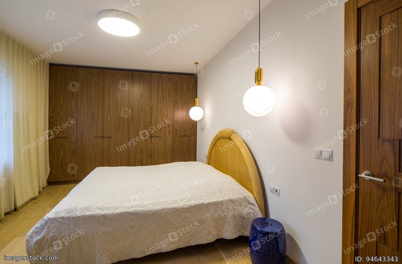 Light interior of bedroom. Made-up bed with white cover. Wooden wardrobe. Private house.
