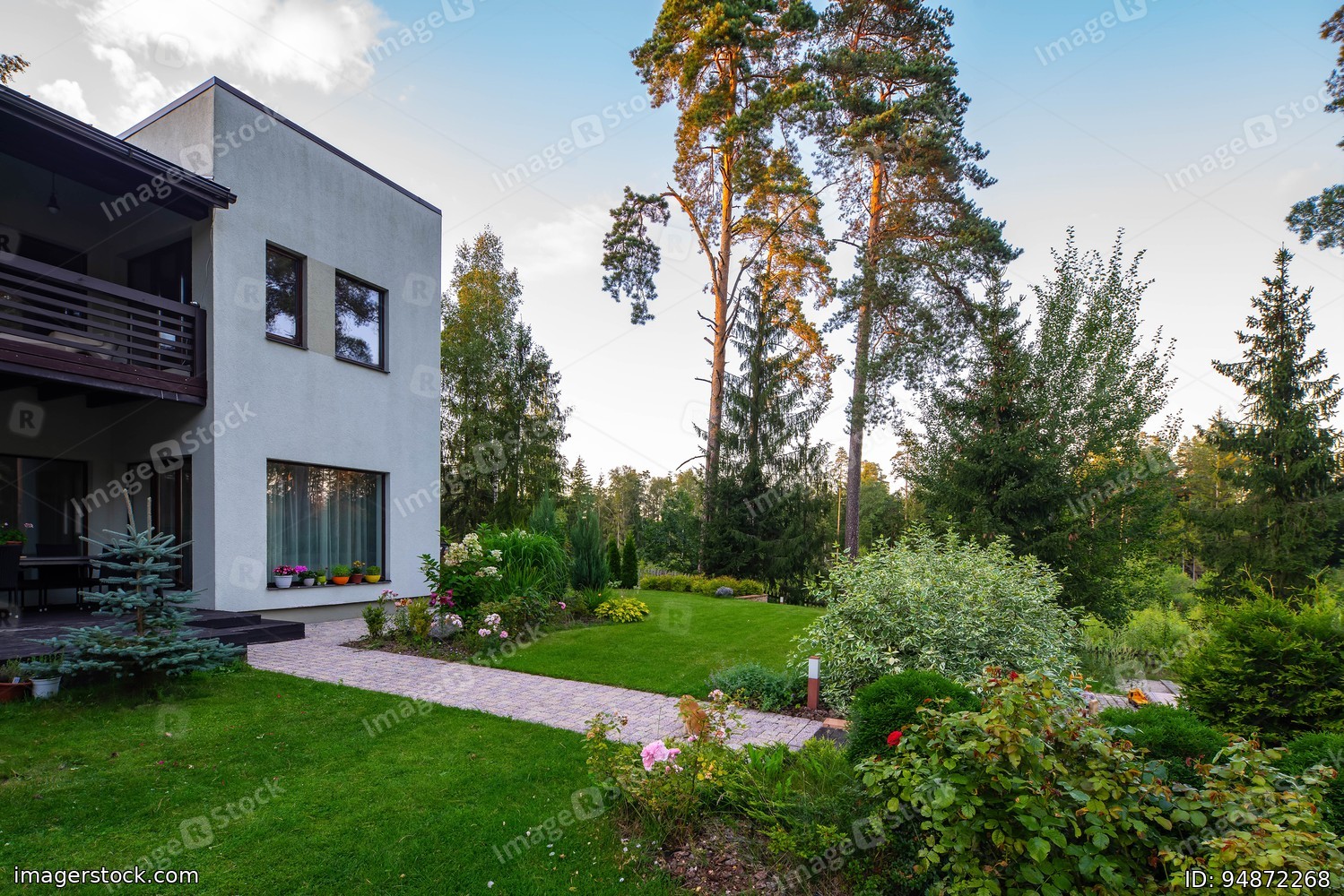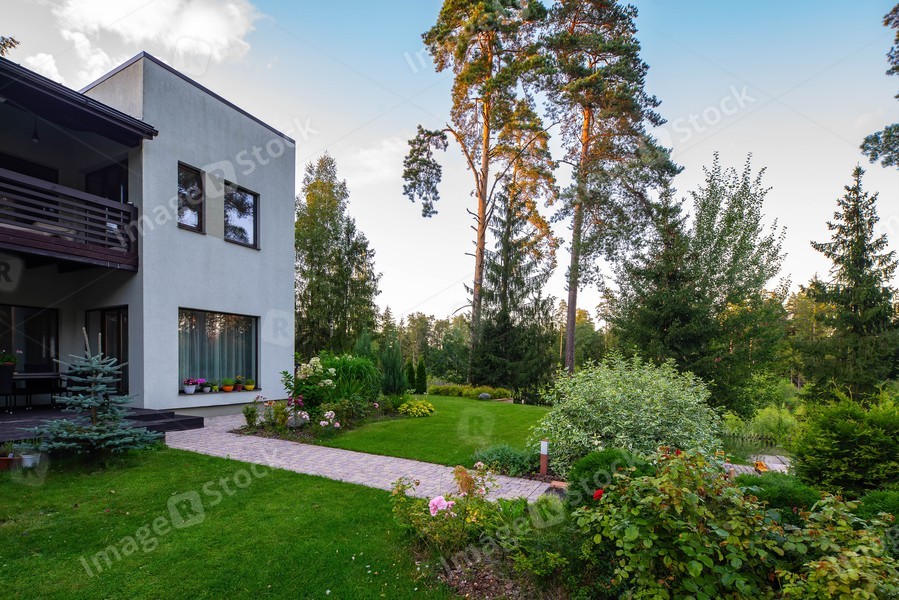 Modern exterior of private cottage near the pine forest. View of beautiful garden with flowers, bushes and trees.