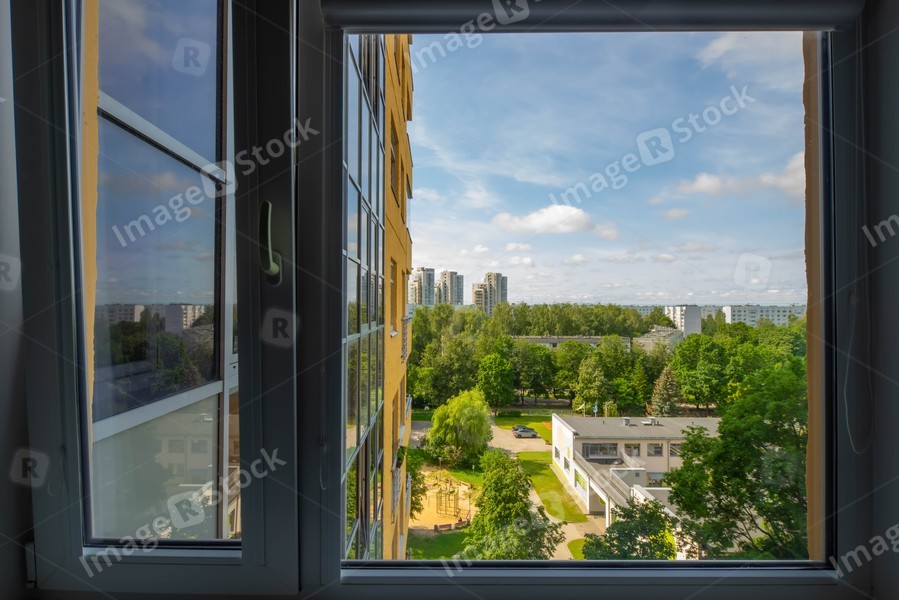 Modern city architecture. View from window. Sunny summer day.
