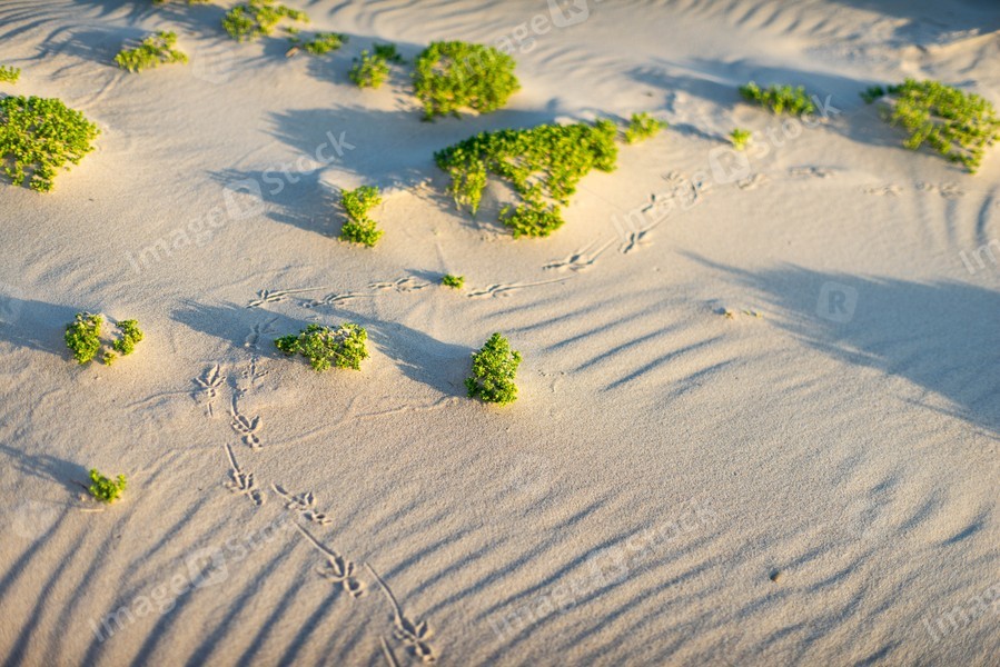Bird tracks on a sandy beach. Small bushes of green grass.