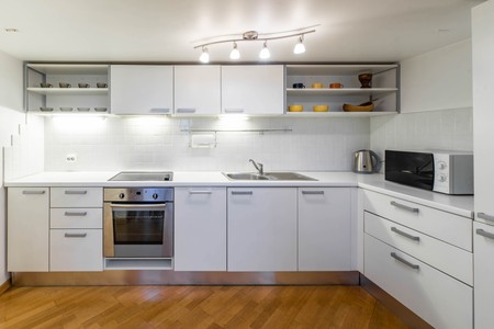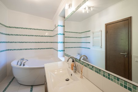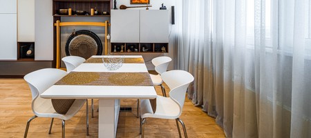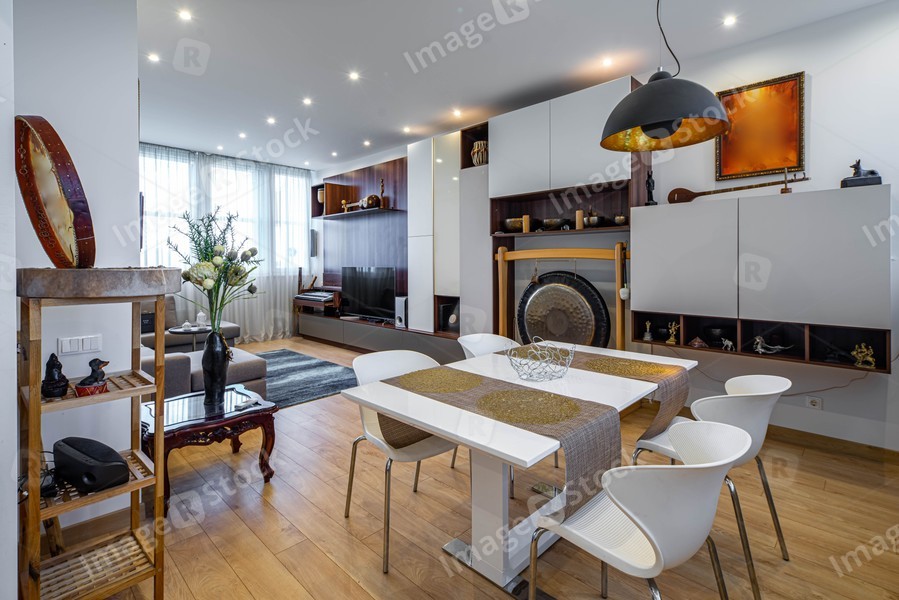 Luxury interior of living room with furniture in apartment. Chairs and table. White wall unit with Tibetian bowls and decorative gong.