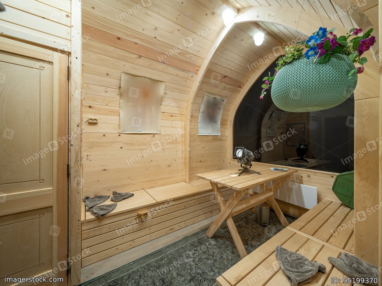 Wooden interior of modern bathhouse. Table and benches.