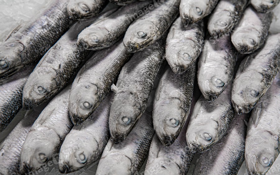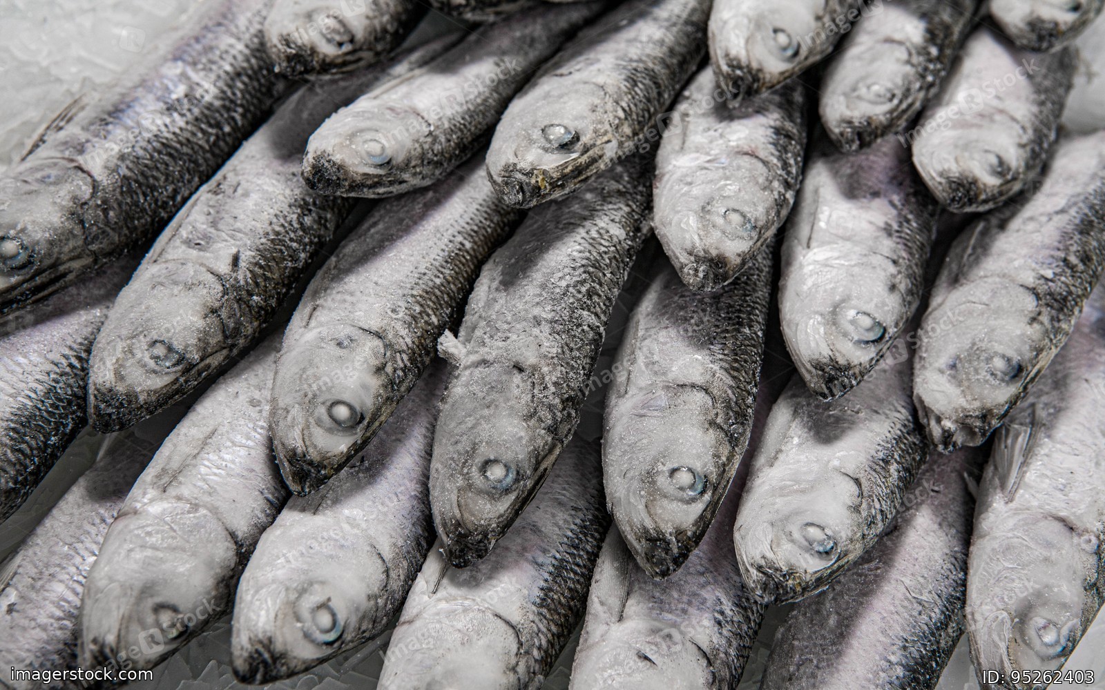 Close-up of fresh sprat on the ice in fish market. Winter fishing. Small silver fish production.