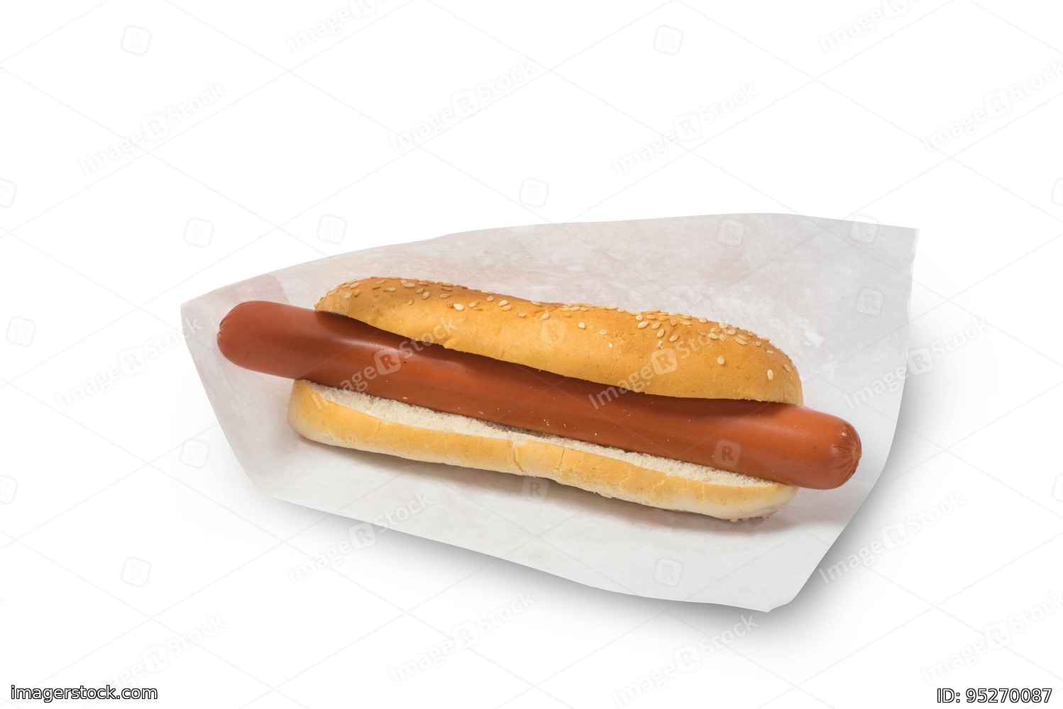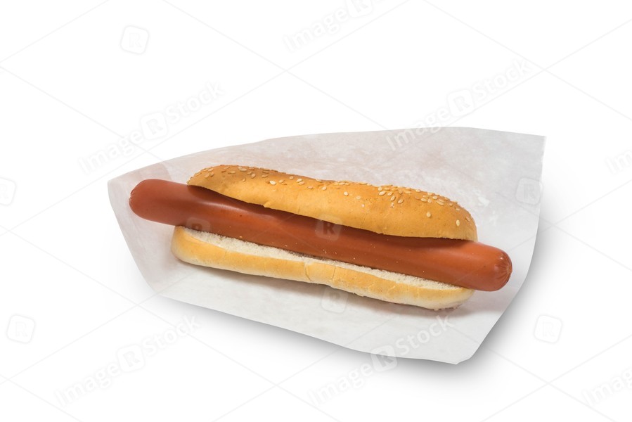 Bread and sausage. White background. Fast food. Hot-dog.
