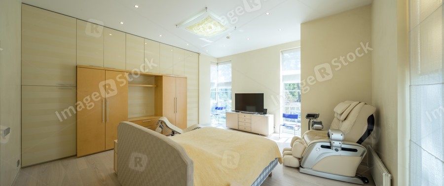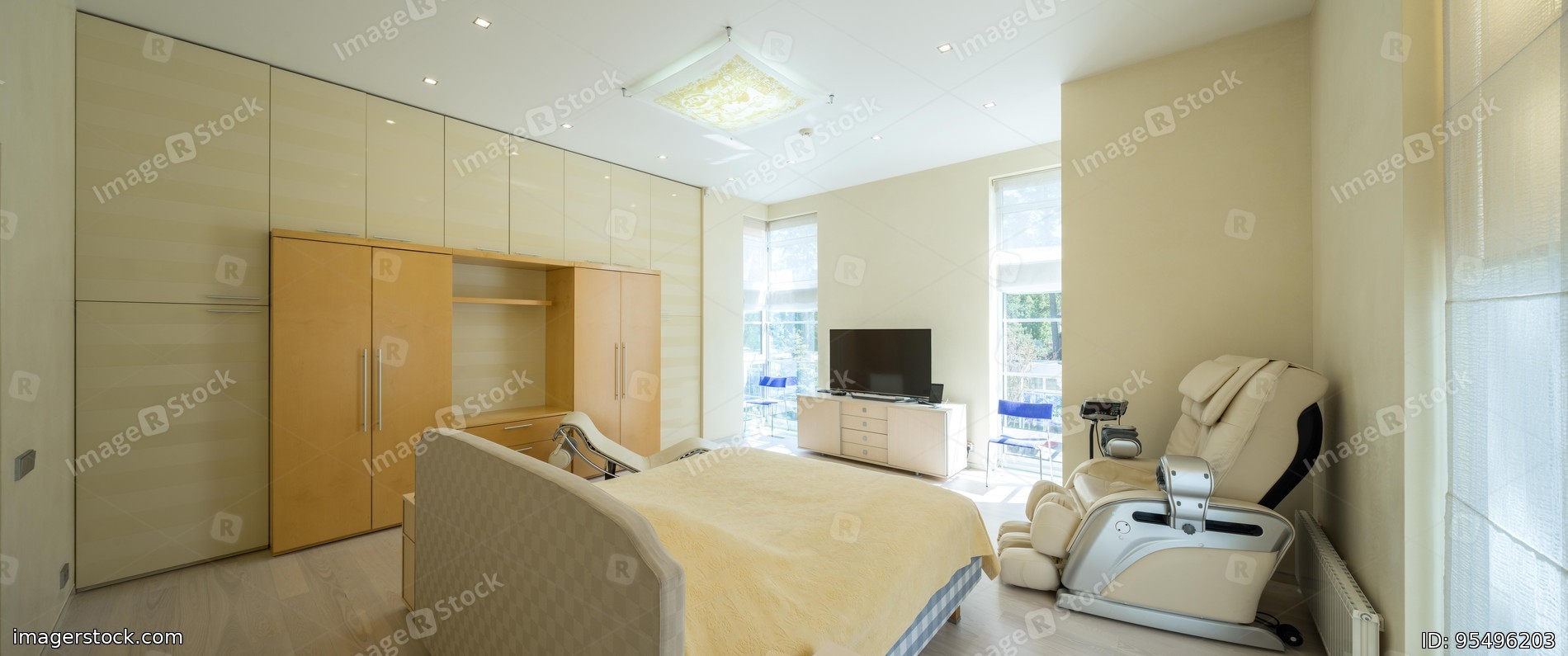 Yellow interior. Bedroom in luxury apartment. Cozy bed. Massage chair.