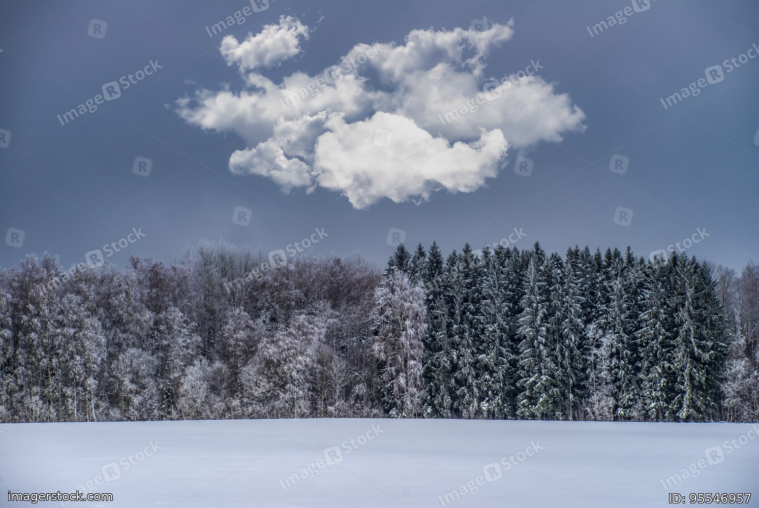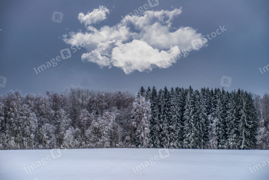 Beautiful winter landscape. Snowy forest. Cloud in sky.