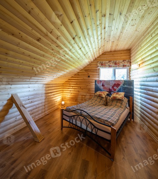 Eco wooden interior of attic bedroom in private country house. Soft cozy bed.