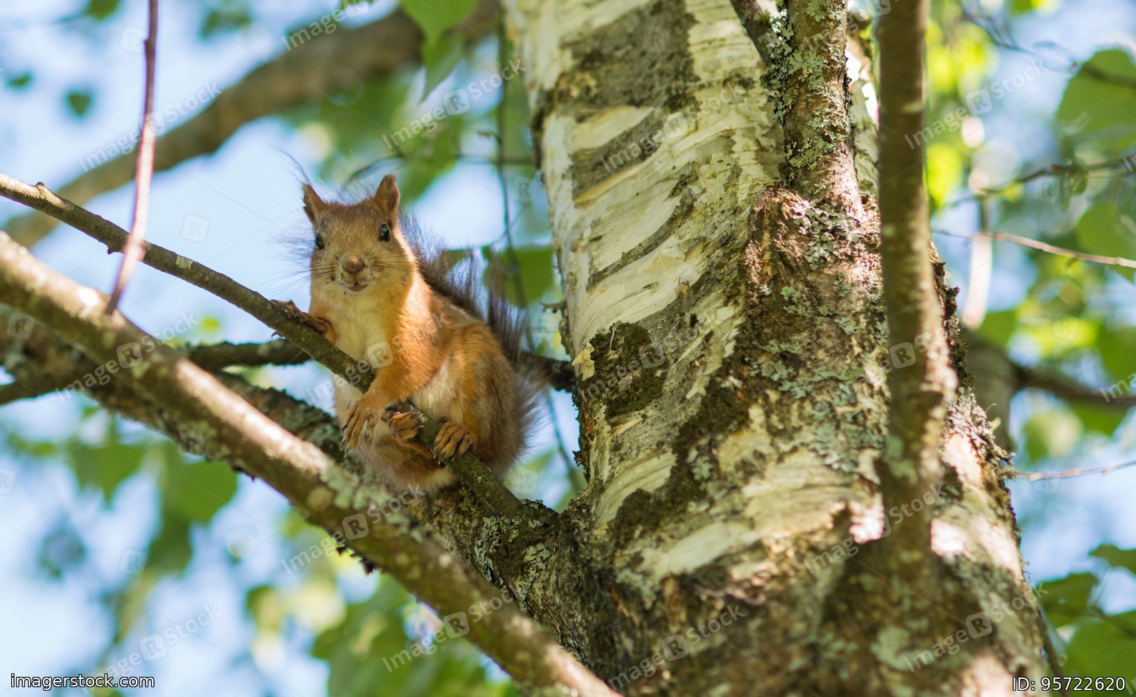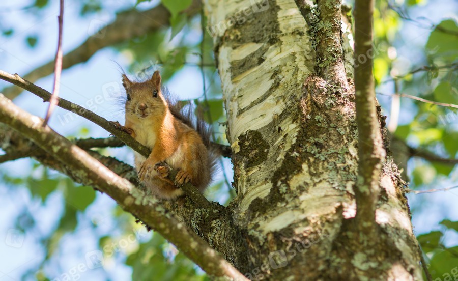 Little cute squirrel sitiing on a birch