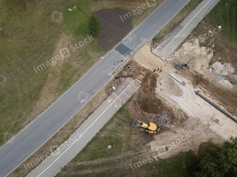 View from above of road construction works. Yellow digger and road roller. Asphalt road. Pedestrian and bicycle path.