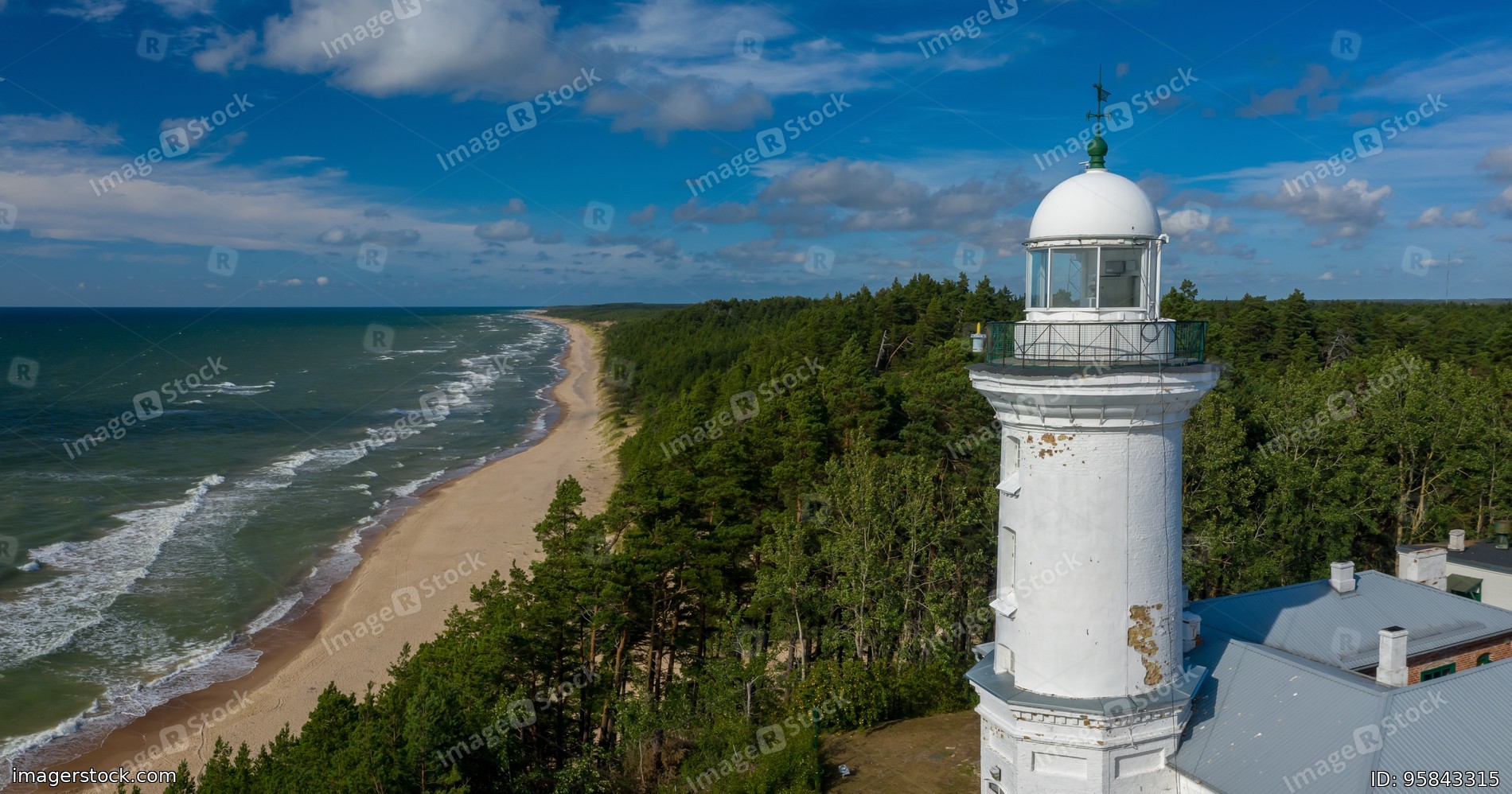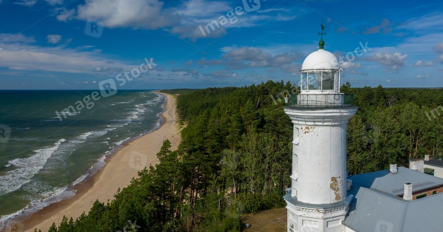Panorama top view of the sea and the Uzhava lighthouse. Blue sky. Green forest.
