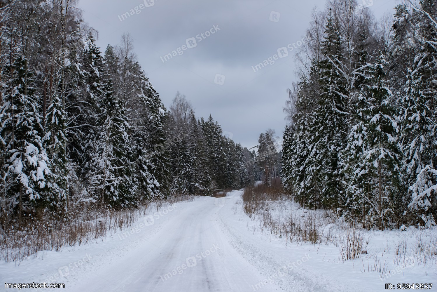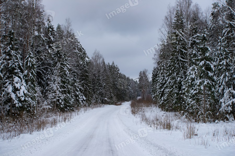 Beautiful winter landscape. Road in snowy forest.