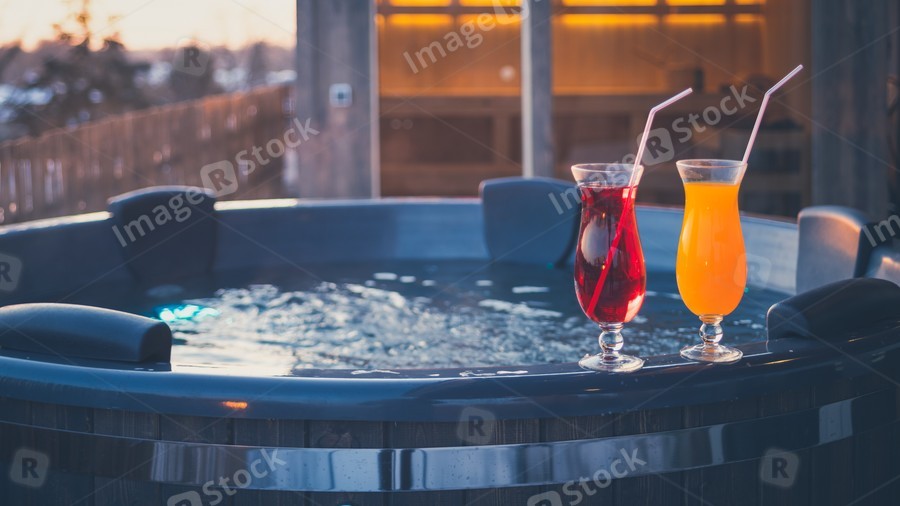 Hot outdoor wooden bath tub on terrace of private house. Finnish sauna