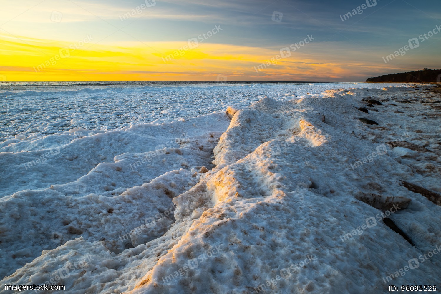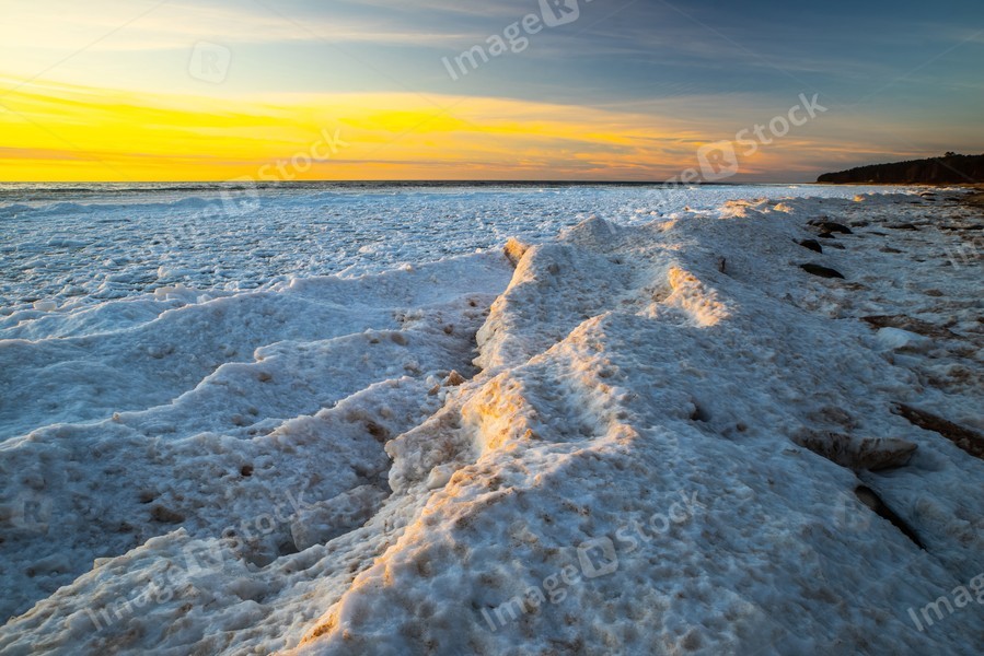 Close-up of snow and ice on sea shore at winter. Sunset sky.