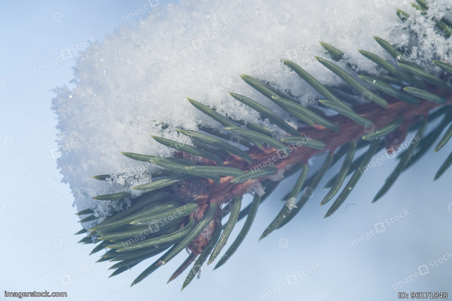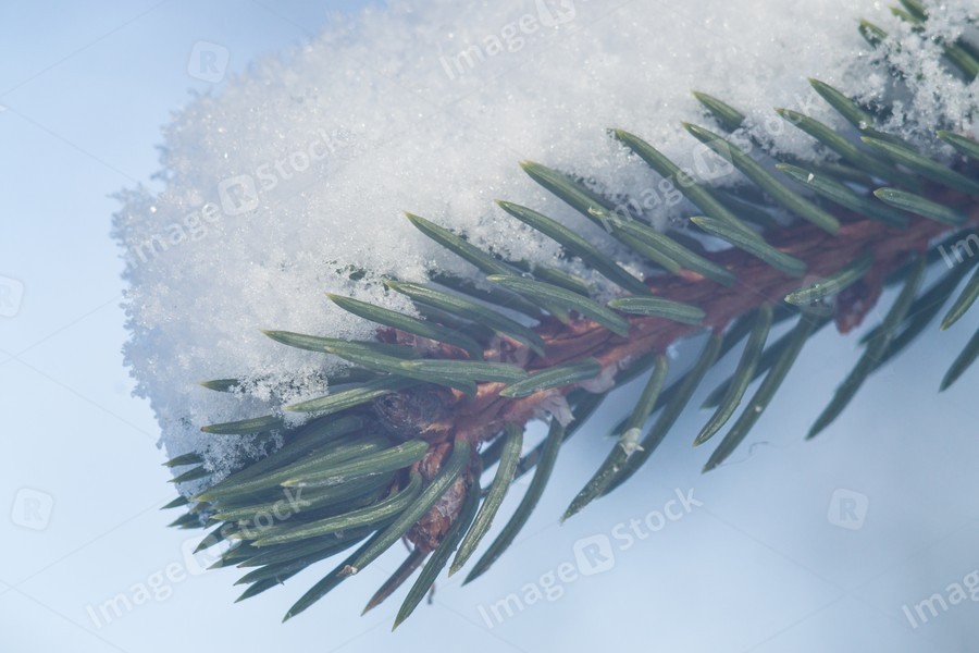 Fir-tree branch with a hat of snow on sunny winter day